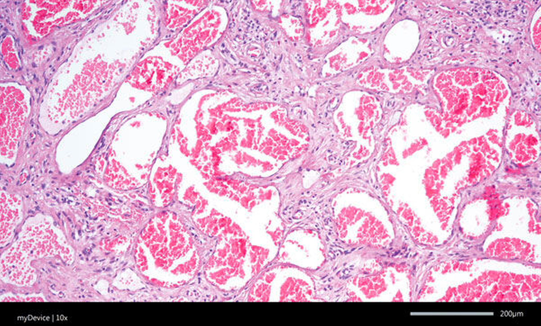 Nach präoperativer Sklerosierung des Wangenhauptbefunds (Abbildung 4) erfolgte am Folgetag die Resektion in Intubationsnarkose. Hierzu wurde nach subziliärer Schnittführung (Abbildung 5) eine scharfe Präparation des Tumors nach kaudal unter Schonung des Ramus buccalis des Nervus facialis durchgeführt (Abbildung 6) und dieser schließlich exzidiert (Abbildung 7). In der histopathologischen Aufarbeitung zeigten sich Muskel-, Fett- und Weichgewebe mit reichlich interponierten, kavernös konfluierenden, blutgefüllten Gefäßformationen unterschiedlicher Größe (Abbildung 8). Der postoperative Verlauf gestaltete sich bis auf eine vorübergehende Einschränkung der Fazialisfunktion im Bereich des Mundastes unauffällig, sodass der Patient zeitnah in die ambulante Weiterbetreuung entlassen werden konnte.