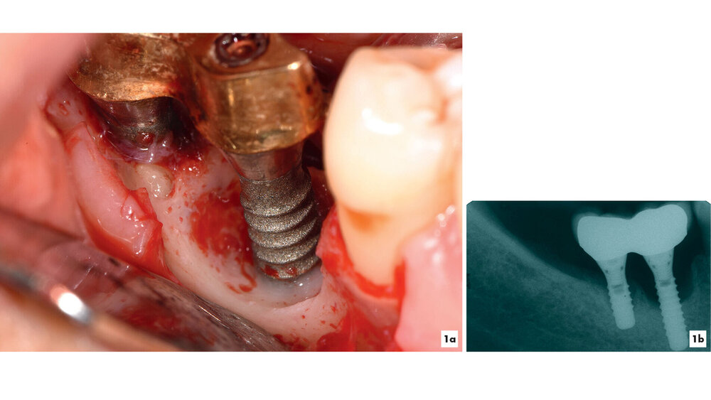 Kommt es jedoch zur Ausbildung einer Inflammation periimplantärer Gewebe ohne Knochenverlust, spricht man von einer periimplantären Mukositis. Wichtigstes Kennzeichen sind dabei die Blutung auf Sondierung und die Begrenzung der Entzündung auf das periimplantäre Saumepithel [Berglundh et al., 2018]. Breitet sich der pathologische Prozess in den Bereich des knöchernen Attachments aus, ist die Destruktion irreversibel und man spricht von einer Periimplantitis (Abbildung 1a). Zusätzlich zu den bereits genannten klinischen Kennzeichen kann man hier auch röntgenologisch den Knochenverlust feststellen, der mit erhöhten Sondierungstiefen und/oder Rezessionen einhergeht [Berglundh, 2019] (Abbildung 1b).