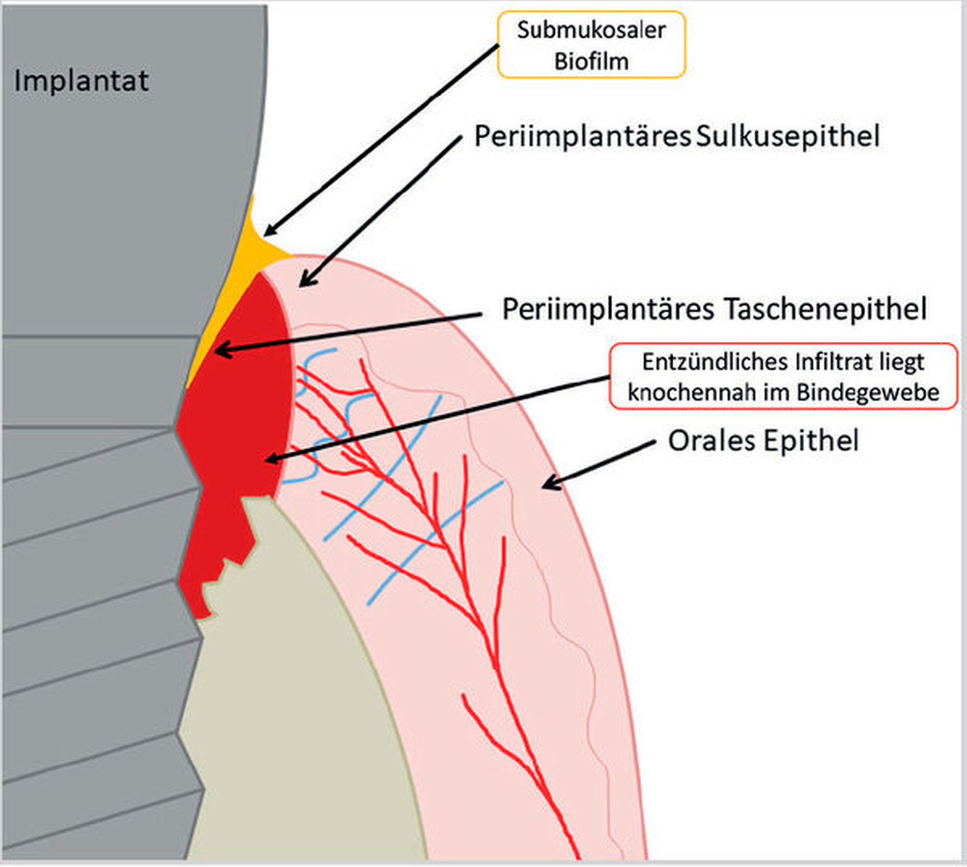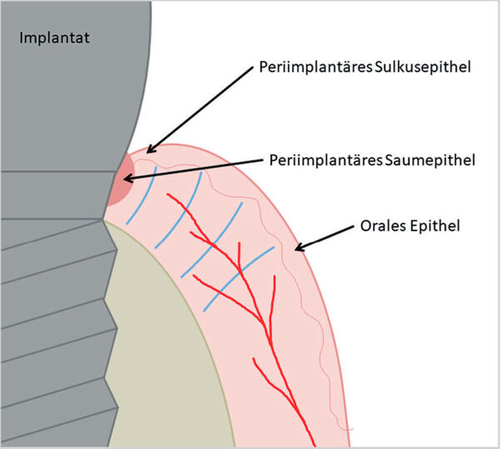 Nach Implantation heilt das dentale Implantat idealerweise ossär ein. Es bildet sich eine Knochen-Implantat-Verbindung aus – eine direkte strukturelle und funktionelle knöcherne Anlagerung an die synthetische Oberfläche des belasteten Implantats [Albrektsson et al., 1981; Albrektsson et al., 1986; Schroeder et al., 1976]. Diese Verankerung ist als Osseointegration bekannt [Branemark et al., 1969; Branemark et al., 1977]. Die periimplantäre Gesundheit ist definiert als klinisch gesundes Hart- und Weichgewebe um ein osseointegriertes Implantat. Dabei kann dies lediglich durch die Abwesenheit klassischer Entzündungszeichen beurteilt werden. Dazu gehören die Abwesenheit von Schwellung, Blutung auf Sondierung und Rötung des periimplantären Weichgewebes [Berglundh et al., 2018].