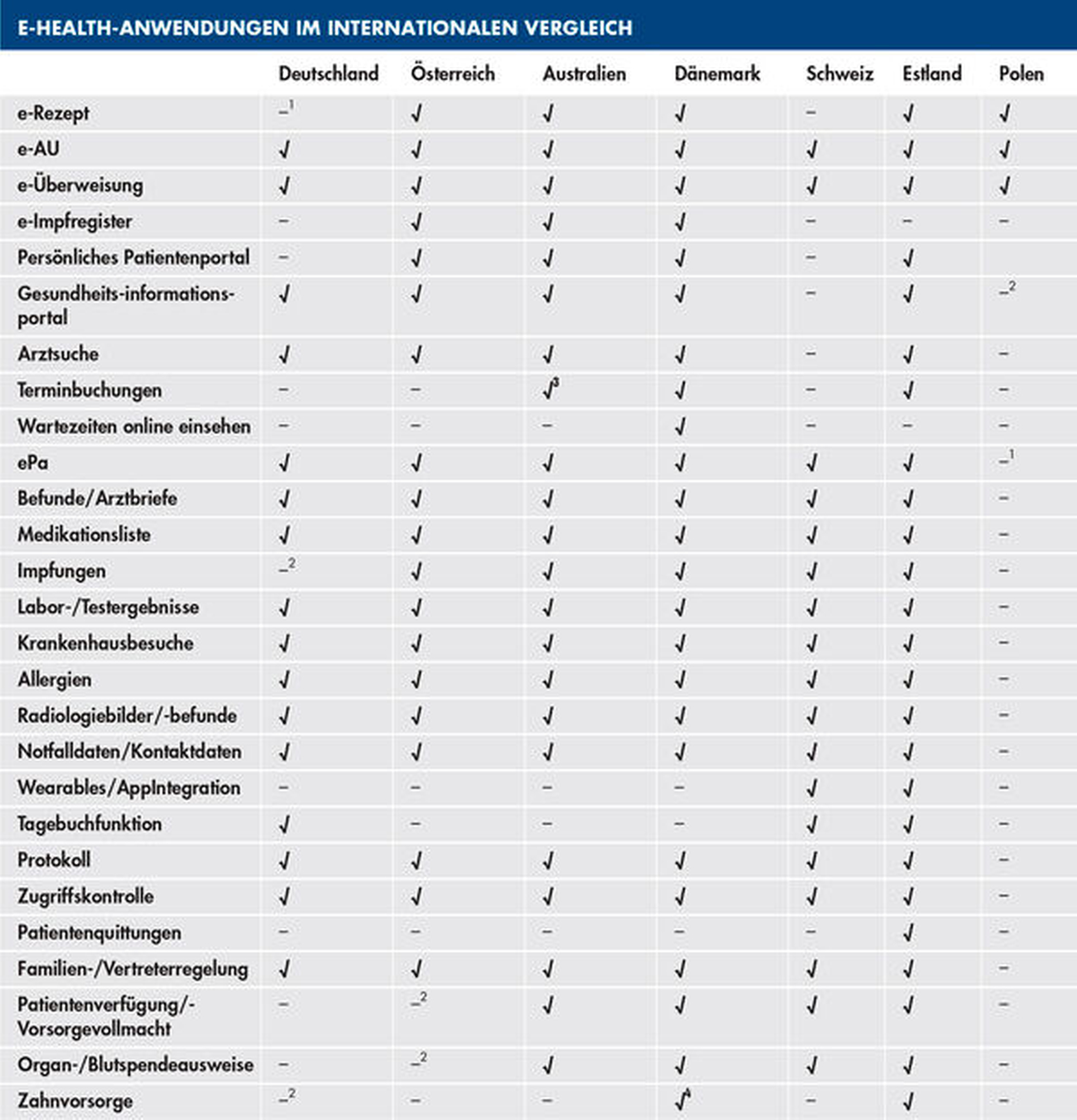 Wie der Ländervergleich zeigt, liegt der Fokus in Deutschland auf dem Informationsaustausch und damit auf einer Weiterentwicklung der analogen Welt („Papierakten“). Der Nutzen liegt hier vor allem in einer verbesserten Dokumentation. In anderen Ländern hingegen liegt der Schwerpunkt auf Mehrwert- und Servicefunktionen. So bieten Anwendungen dort auch Tipps für das individuelle Gesundheitsmanagement oder unterstützen bei der Planung von Arztterminen, was den Autoren zufolge zu einer schnellen und hohen Akzeptanz in der breiten Bevölkerung führt. Das „deutsche Modell“ sei im Unterschied dazu eher akademisch gedacht – möglicherweise ein Grund, weshalb der Ausbau von E-Health in Deutschland nur mühsam vorankommt, heißt es in der Analyse.
