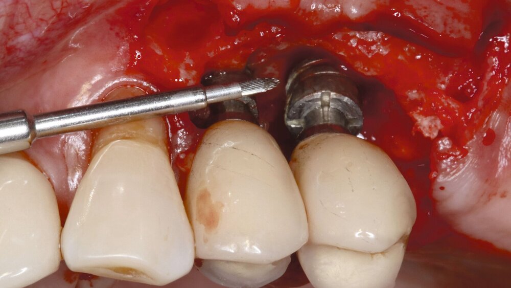 Wenn das Therapieziel (BOP ≤ 1 je Implantat, fehlende Suppuration, ST ≤ 5 mm) durch eine nichtchirurgische Therapie nicht erreicht werden kann, wird frühzeitig eine chirurgische Intervention empfohlen (Abbildung 3). Verschiedene chirurgische Therapiemaßnahmen werden beschrieben, einschließlich Lappenoperation, resektiver und rekonstruktiver Maßnahmen sowie einer Kombination aus beiden (Abbildung 4). Alle umfassen die Entfernung von Granulationsgewebe und eine Dekontamination der Implantatoberflächen [Schwarz et al., 2022].