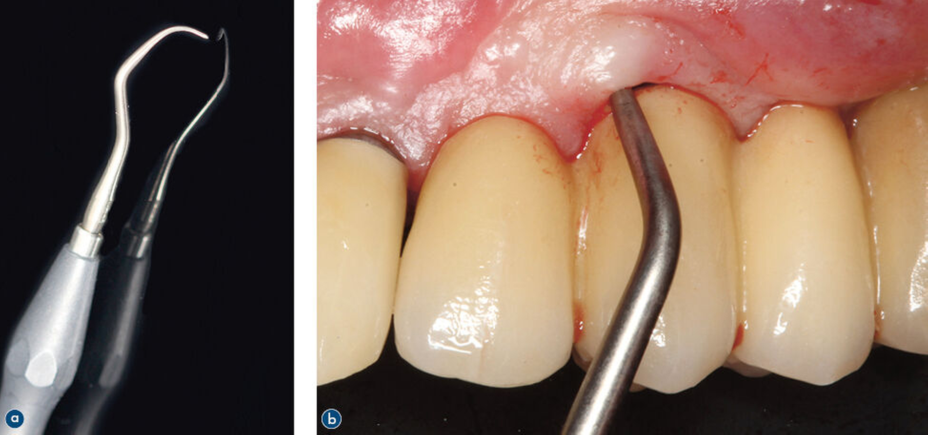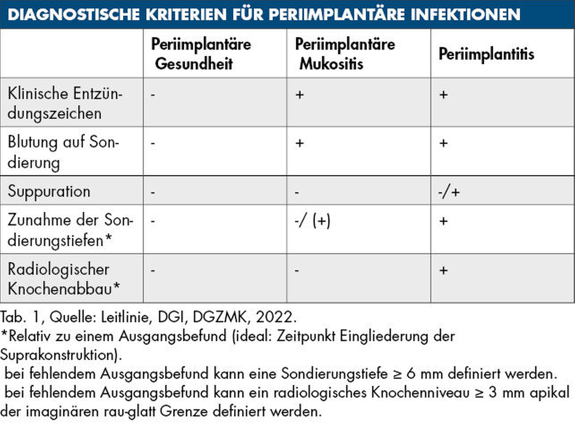 Periimplantäre Infektionen lassen sich durch visuelle Inspektion, Palpation und Sondierung diagnostizieren. Die Erhebung der Blutung auf Sondierung (BOP) spielt hierbei eine übergeordnete Rolle. Bei bestehendem Verdacht auf Periimplantitis sollte eine radiologische Untersuchung erfolgen und frühere Messungen der Sondierungstiefen sollten berücksichtigt werden. Ein Anstieg der Sondierungstiefen in Verbindung mit positiver BOP ist ein Hinweis auf Periimplantitis und ein Indikator für den Schweregrad der Erkrankung. Suppuration ist charakteristisch für eine Periimplantitis – deren Fehlen schließt die Diagnose aber nicht aus [Schwarz et al., 2018]. Weiterhin kann die Entstehung mukosaler Rezessionen ein Indikator für eine fortgeschrittene Periimplantitis sein.