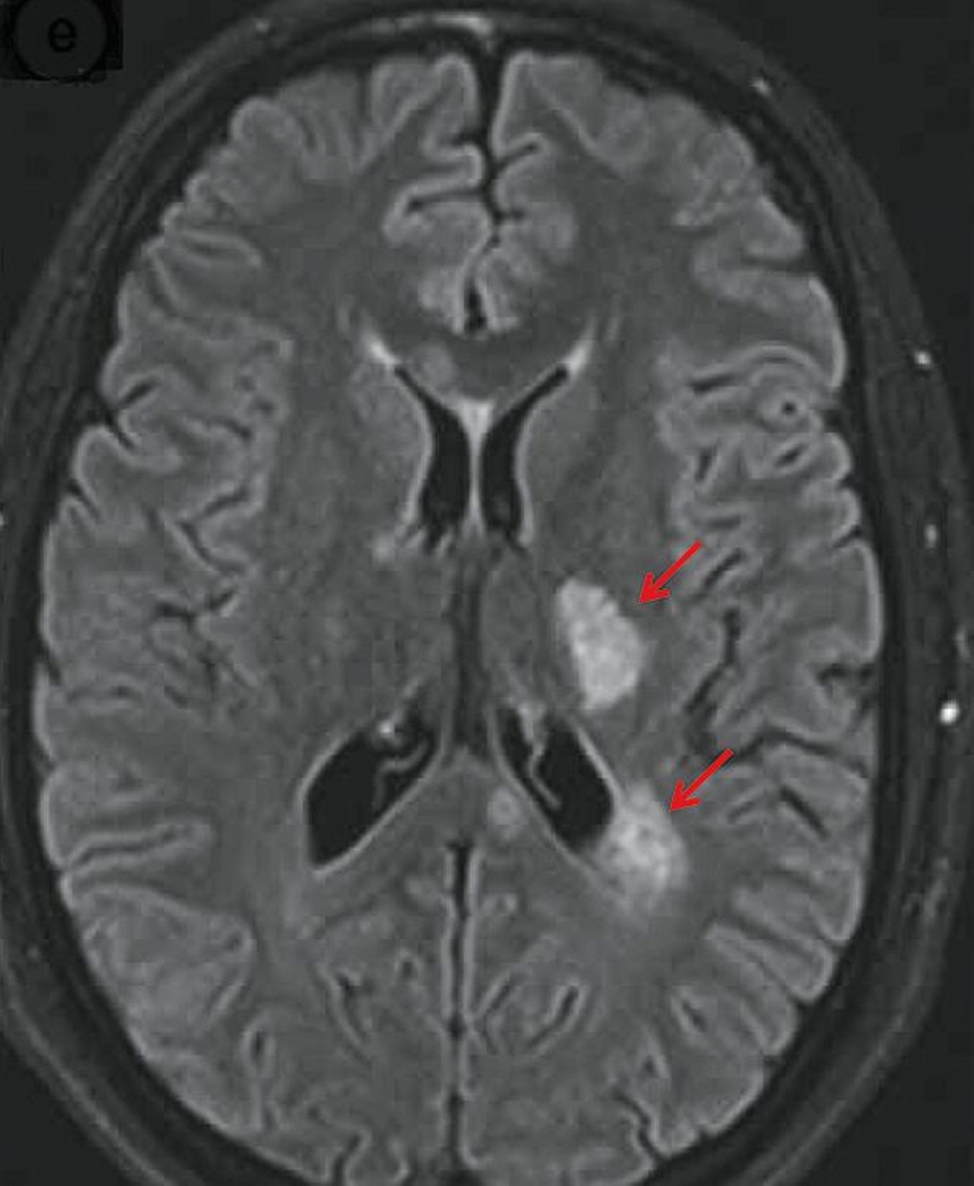 Zwei Tage später stellte sich die Patientin zur weitergehenden Diagnostik in der Abteilung für Neurologie vor. Inzwischen hatte sich das Taubheitsgefühl auf das Kinn und die Wange rechts ausgebreitet. Zusätzlich konnte in der klinischen Untersuchung eine Pallhypästhesie (herabgesetztes Vibrations-Empfinden) radial und malleolär rechts nachgewiesen werden. Laborchemisch ergab sich erneut kein wegweisender Befund. Es wurde eine kraniale Magnetresonanztomografie durchgeführt, die tatsächlich den Nachweis mehrerer T2-hyperintenser (FLAIR-Sequenz) Läsionen im intermediären Marklager beidseits frontal, periventrikulär links frontal, rechts paramedian pontin sowie am Übergang Medulla oblongata/spinalis erbringen konnte. In der Liquorpunktion ließen sich oligoklonale Banden (Typ 2) nachweisen. Die visuell evozierten Potenziale waren beidseits unauffällig. Die Tibialis sensibel evozierten Potenziale (SEP) und die Trigeminus SEP waren beidseits verzögert. In Zusammenschau aller Befunde ergab sich der dringende Verdacht auf eine entzündliche Erkrankung des zentralen Nervensystems, so dass eine intravenöse Therapie mit Methylprednisolon gestartet wurde. Im weiteren Verlauf bestätigte sich die Diagnose einer Multiplen Sklerose. Unter der weiteren Therapie zeigten sich die vormals beschriebenen Symptome vollständig rückläufig.