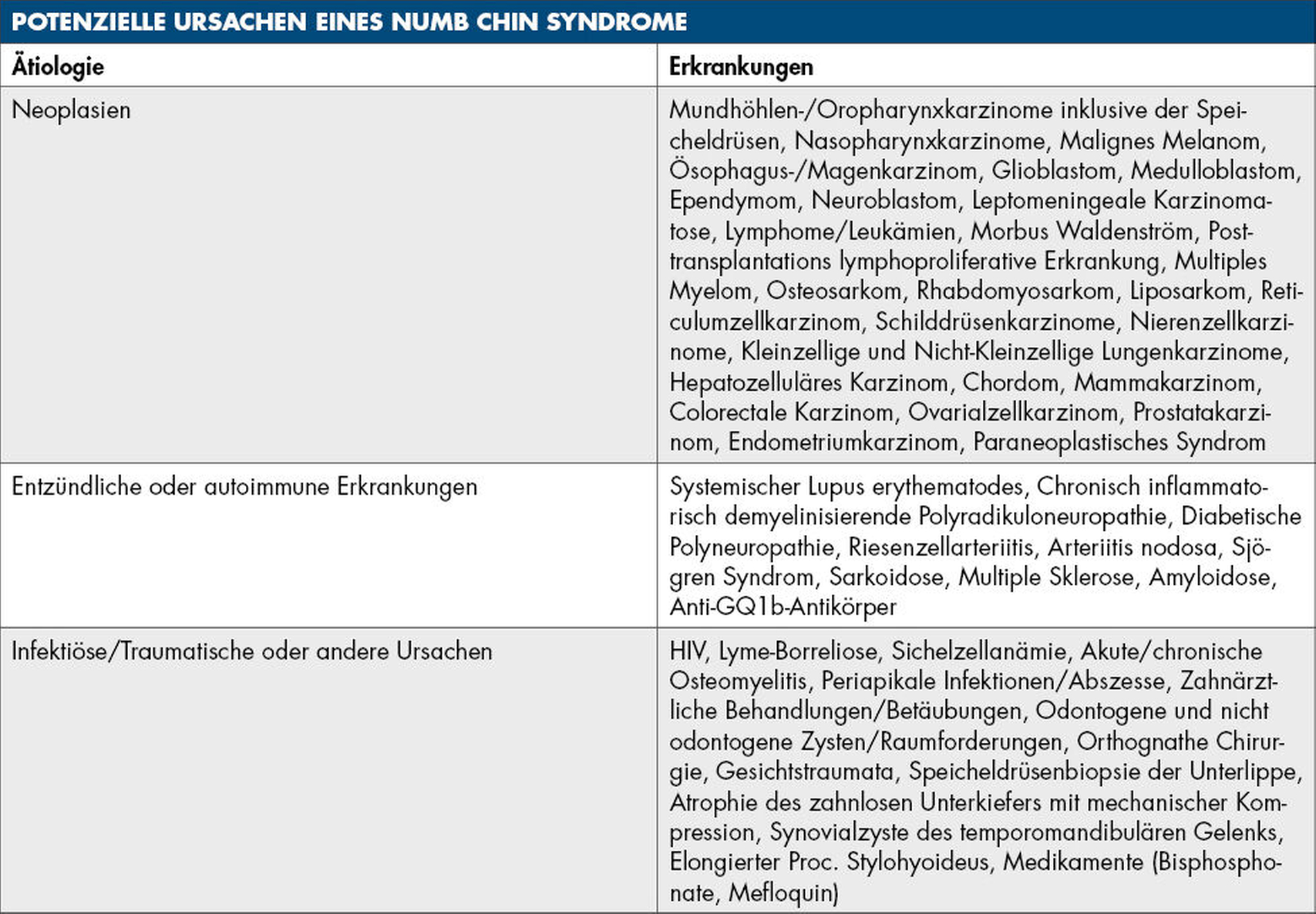 In der Literatur lassen sich verschiedene potenzielle Ursachen eines Numb Chin Syndrome finden. Diese sind in Tabelle 1 aufgeführt. Dabei sind zahnärztliche Prozeduren wahrscheinlich die Hauptauslöser, gefolgt von dentogenen Foki wie apikalen Entzündungen, odontogenen und nicht odontogenen Tumoren, Zysten, akuten und chronischen Osteomyelitiden oder auch mechanischer Kompression im atrophen Unterkiefer [Smith et al., 2015]. Weitaus seltener lassen sich bösartige Neoplasien diagnostizieren. Nur etwa ein Prozent aller Malignome metastasieren überhaupt in den Unterkiefer [D’Silva NJ et al., 2006]. Dann sind Sensibilitätsausfälle im Bereich der Unterlippe und des Kinns aber häufig das erste Symptom der bösartigen Krebserkrankung [Massey EW et al., 1981]. Hier kommt den behandelnden (Zahn-)Ärzten also eine besondere Rolle zu, da sie unter Umständen die Ersten sind, die eine entsprechende Verdachtsdiagnose stellen können. Dabei kann der Primarius in den unterschiedlichsten Organen sitzen und von verschiedenen Zellen ausgehen. Die häufigsten Tumore, die mit Ausfällen im Versorgungsgebiet des N. alveolaris inferior assoziiert sind, stellen Mammakarzinome und Lymphome/Leukämien dar [Lossos et al., 1992].