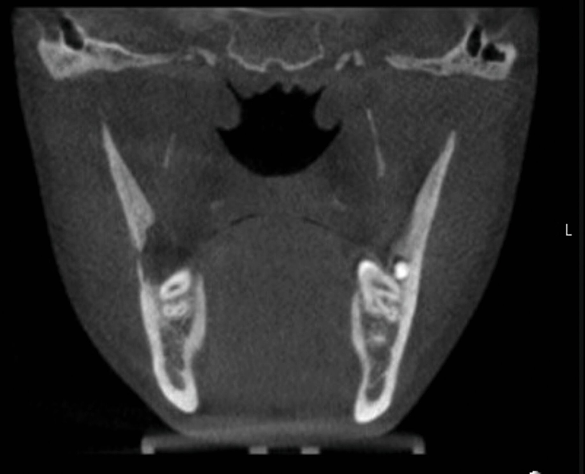 Dieser Patient stellte sich nun mit Schmerzen und Druckdolenz im Kieferwinkel rechts vor. Der enorale Befund zeigte weder eine Fehlokklusion noch ein Os liberum, die faziale Sensomotorik war seitengleich intakt. Die allgemeine Anamnese förderte jedoch eine Osteogenesis imperfecta Typ I zutage („Glasknochenkrankheit“). Das ad domo angefertigte DVT ergab den Befund einer Fraktur an der Linea obliqua rechts (Abbildung 2).