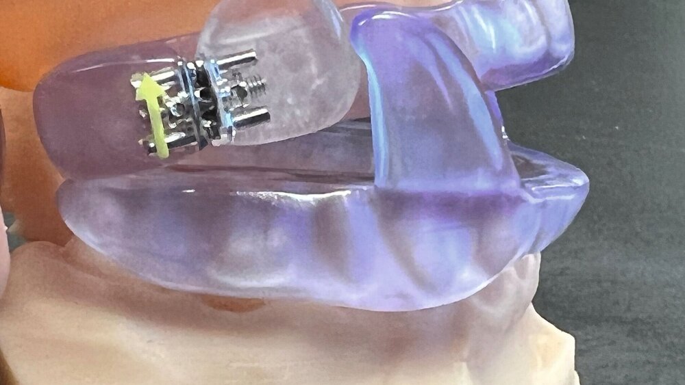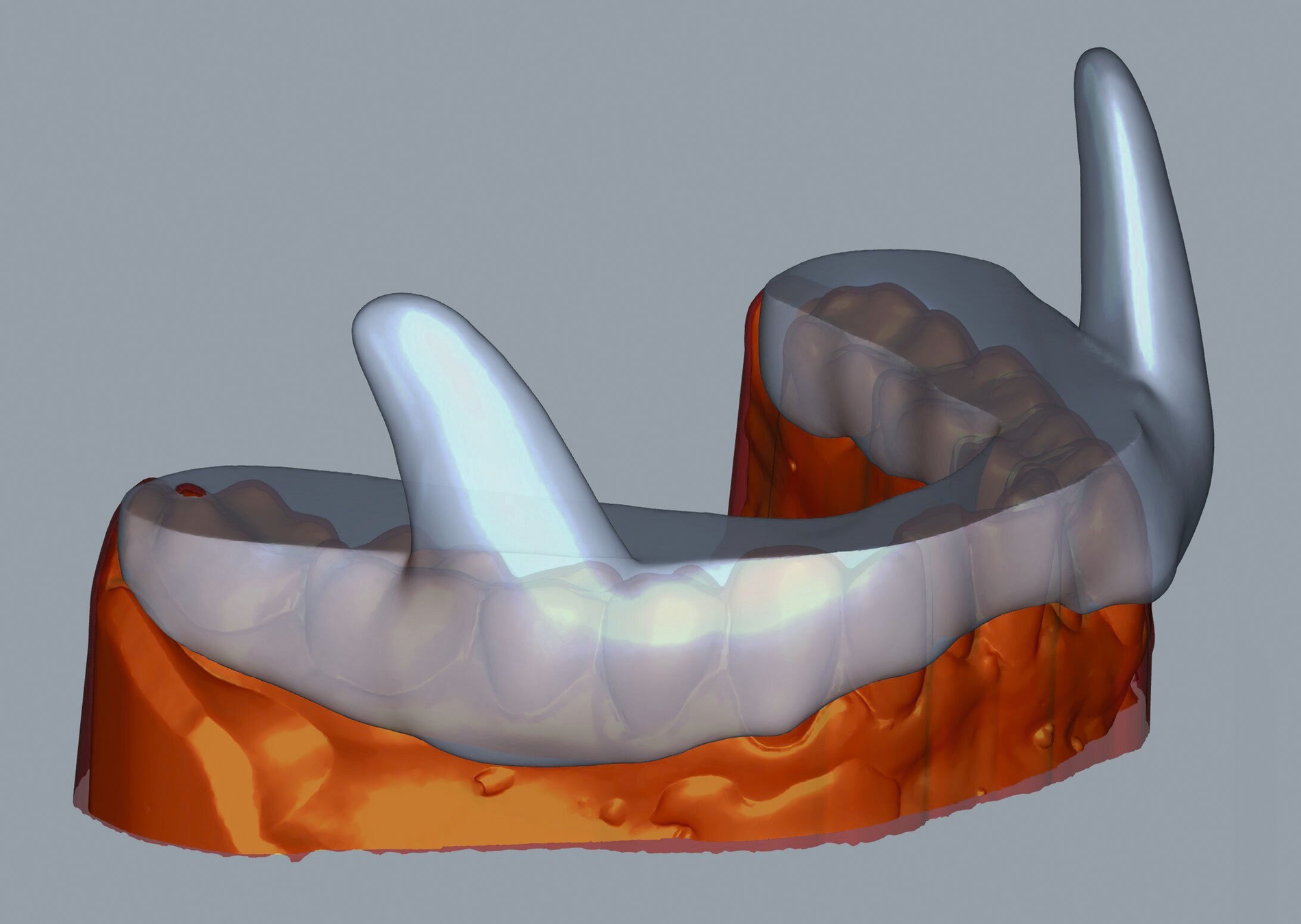 Die Herstellung der F-UPS® inklusive beider seitlicher Flossen und der korrespondierenden Führungsbahnen erfolgt nach Digitalisierung der drei Futar D-Schlüssel (Abbildung 7b) im zahntechnischem Labor. Im 3-D-CAD-Verfahren wurde die Urbauart der F (Abbildung 4) nach standardisierten Vorgaben mithilfe des Programms Exocad patientenbezogen individualisiert (Abbildung 8). Die 3-D-CAM erfolgte im Druckverfahren (lichthärtendes thermoelastisches Resin) (Abbildung 9). Für die stufenlose Justierung der Protrusionszunahme um bis zu 5 mm wurden beidseitig Dehnschrauben zwischen Oberkieferschienenbasis und Führungsfläche verbaut (Abbildung 10).