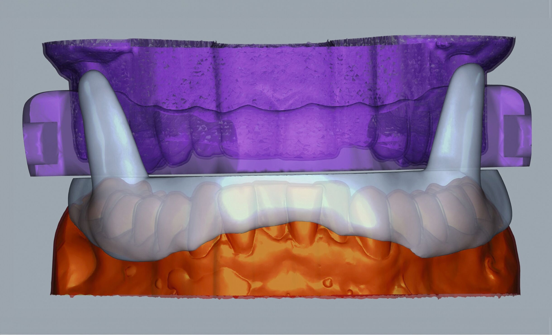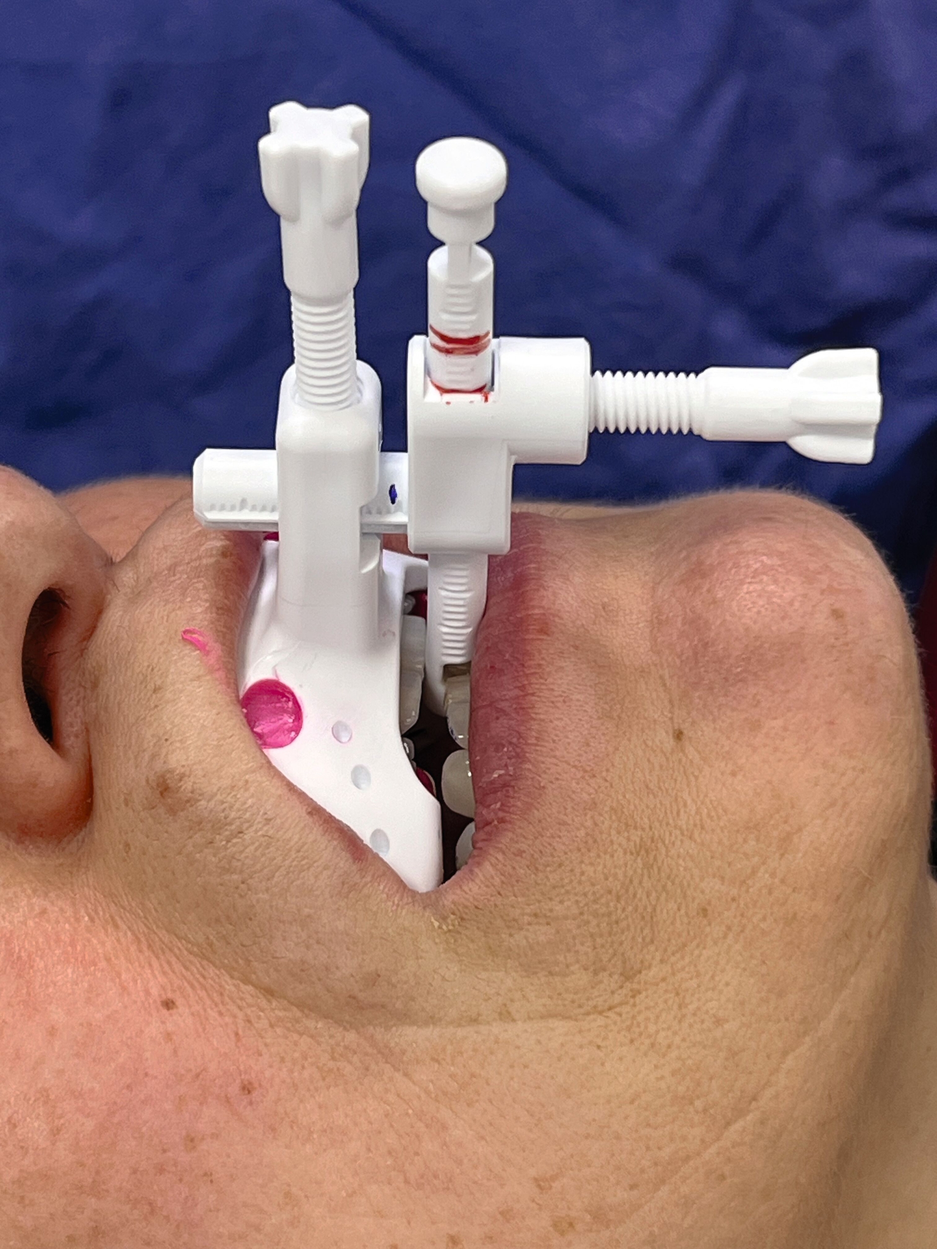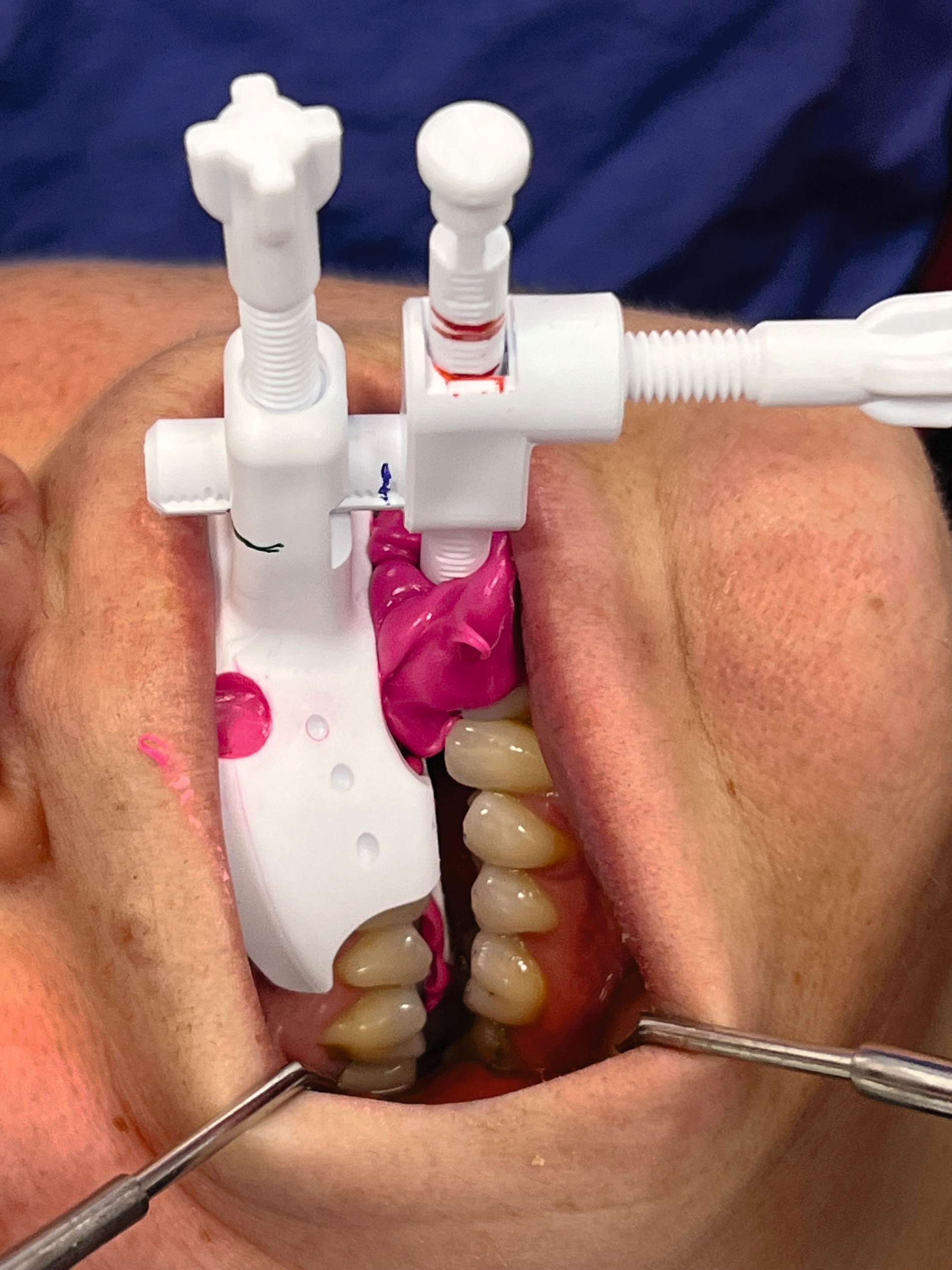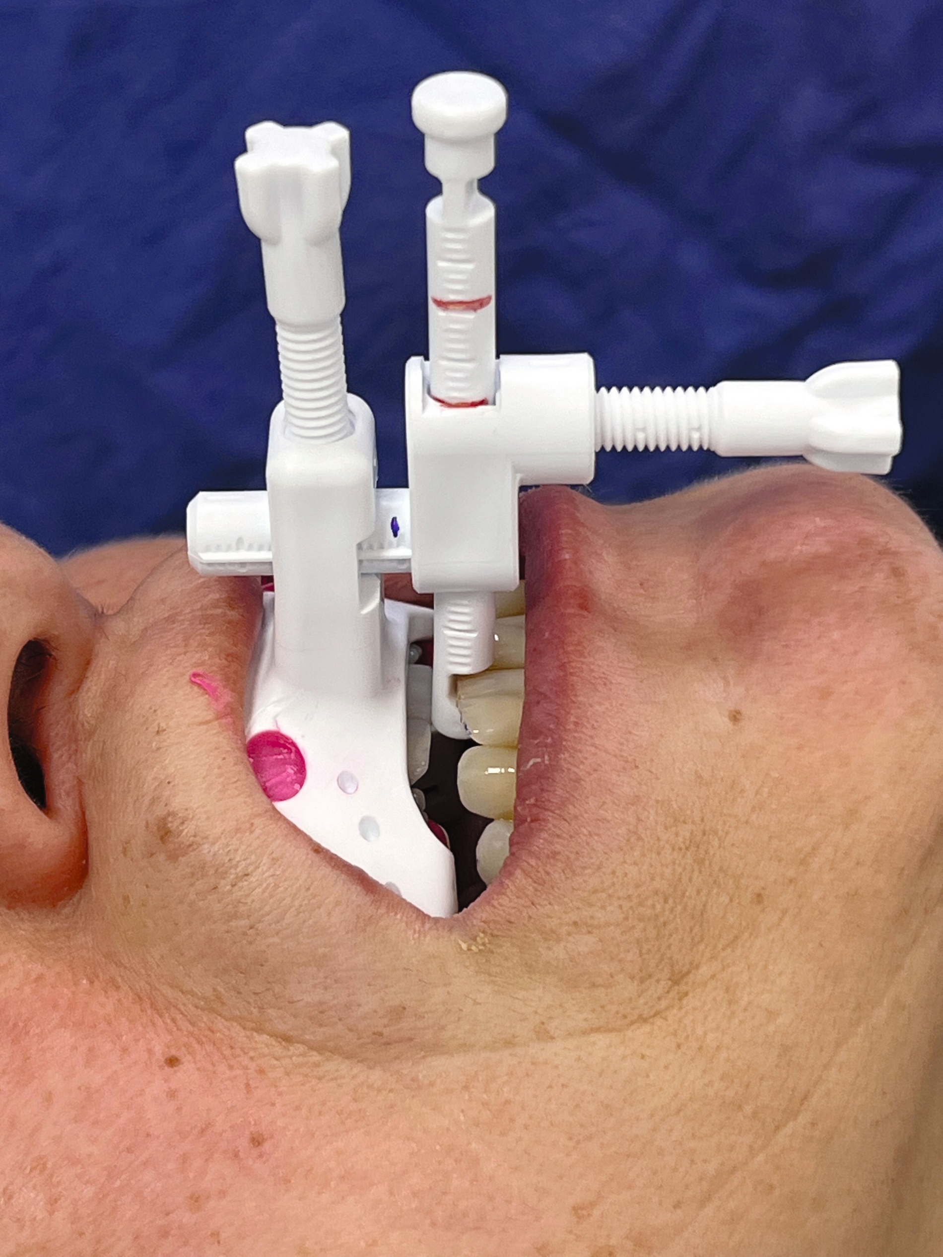 Im vorliegenden Fall kam die temporär am Oberkiefer arbeitsstabil fixierbare, MDR-konforme (Unique Device Identification, UDI 4260731570017T) 3-D-Bissgabel JS-Gauge® (JS) (Abbildung 2) zur Anwendung [Schlieper, 2022]. Diese eignet sich universell für alle Kieferformen und Größen und kann wiederaufbereitet und wiederverwendet werden. Sie besteht aus einem Bisslöffel, gelb markiert, einem vertikalen Stift, violett markiert, und einem horizontalen Stift, blau markiert, sowie zwei Feststellschrauben, grau markiert. Der vertikale und der horizontale Stift lassen sich stufenlos sowohl drehen als auch verschieben. Dies ermöglicht ohne weitere Maßnahmen wie Einschleifen oder Auftragen eine 3-D-Justierung des Unterkiefers unter sicherer Auflage inzisal. Die JS lässt die Front- und die Seitenzähne labial beziehungsweise bukkal frei, so dass ein Justieren der Startprotrusionsposition unter Sicht und die Registrierung der SPP auch mit dem Intraoralscanner möglich ist.