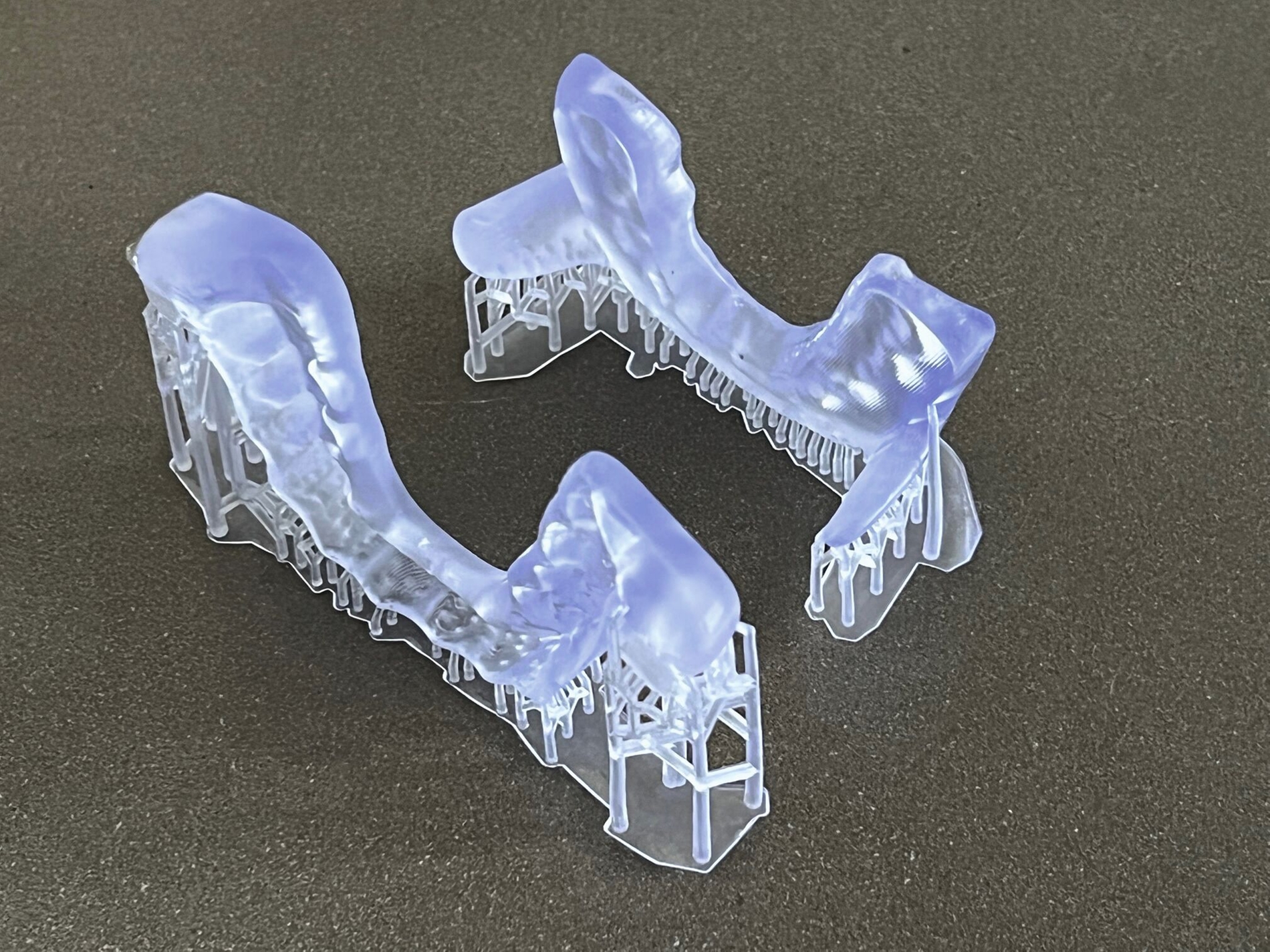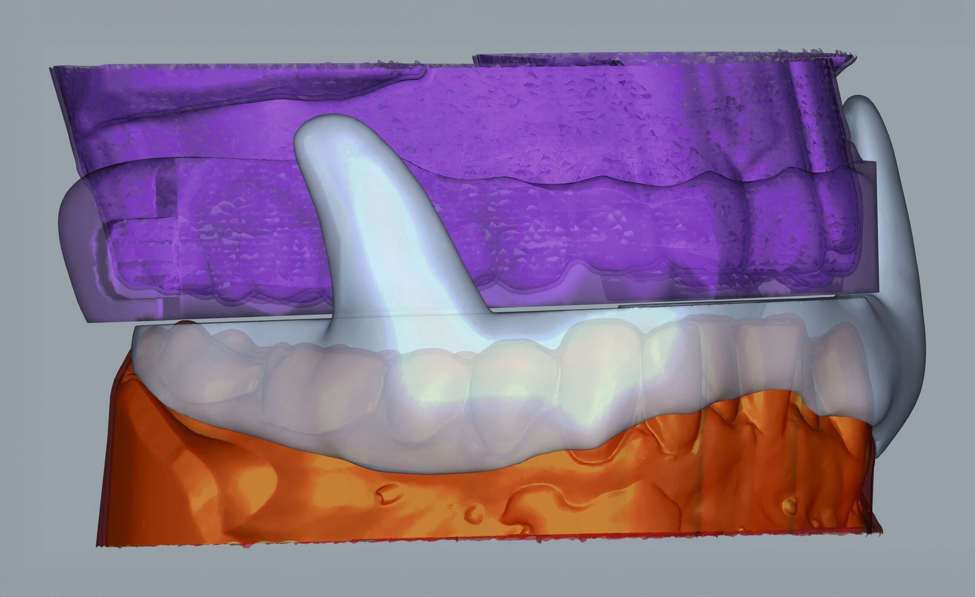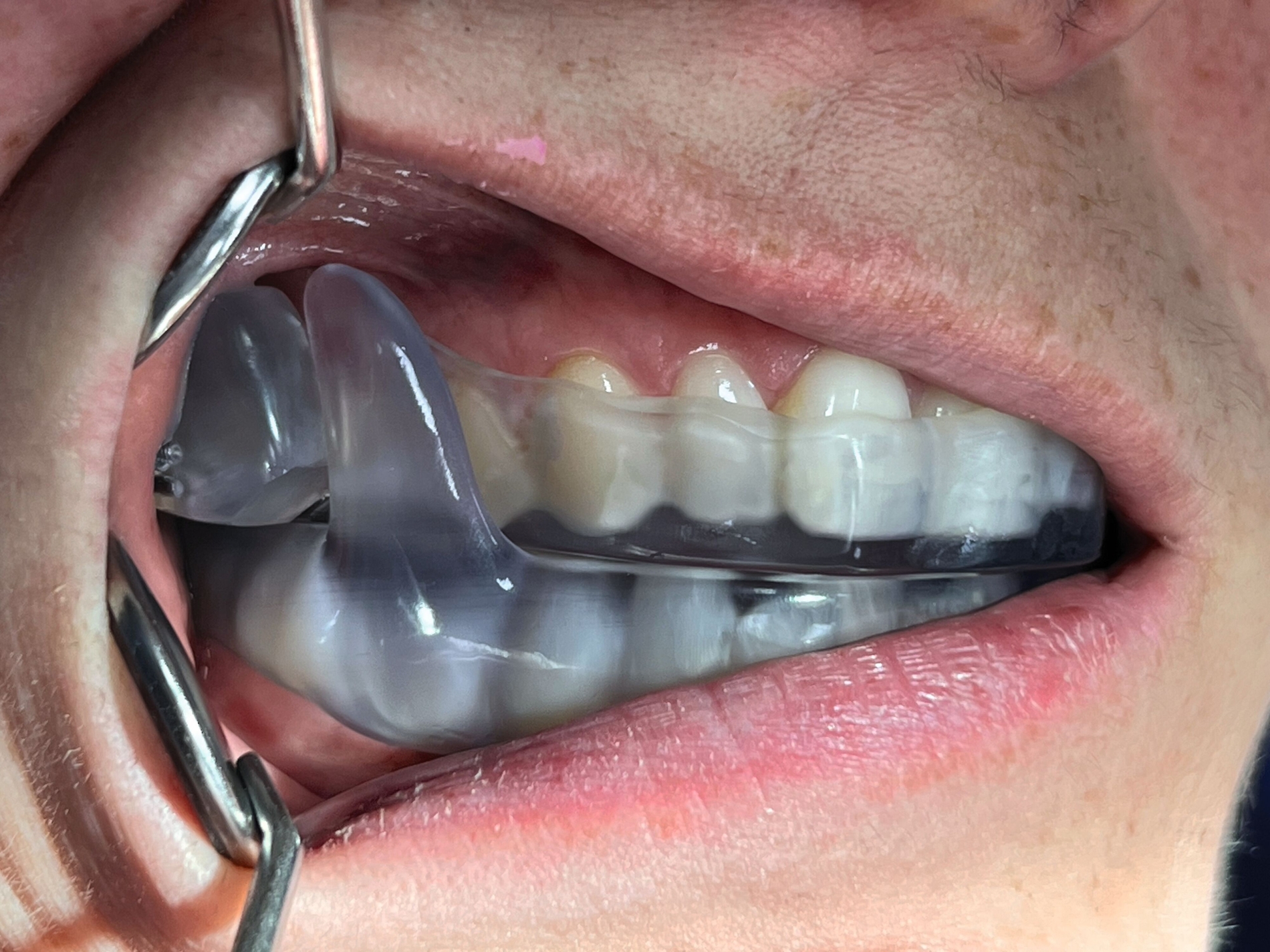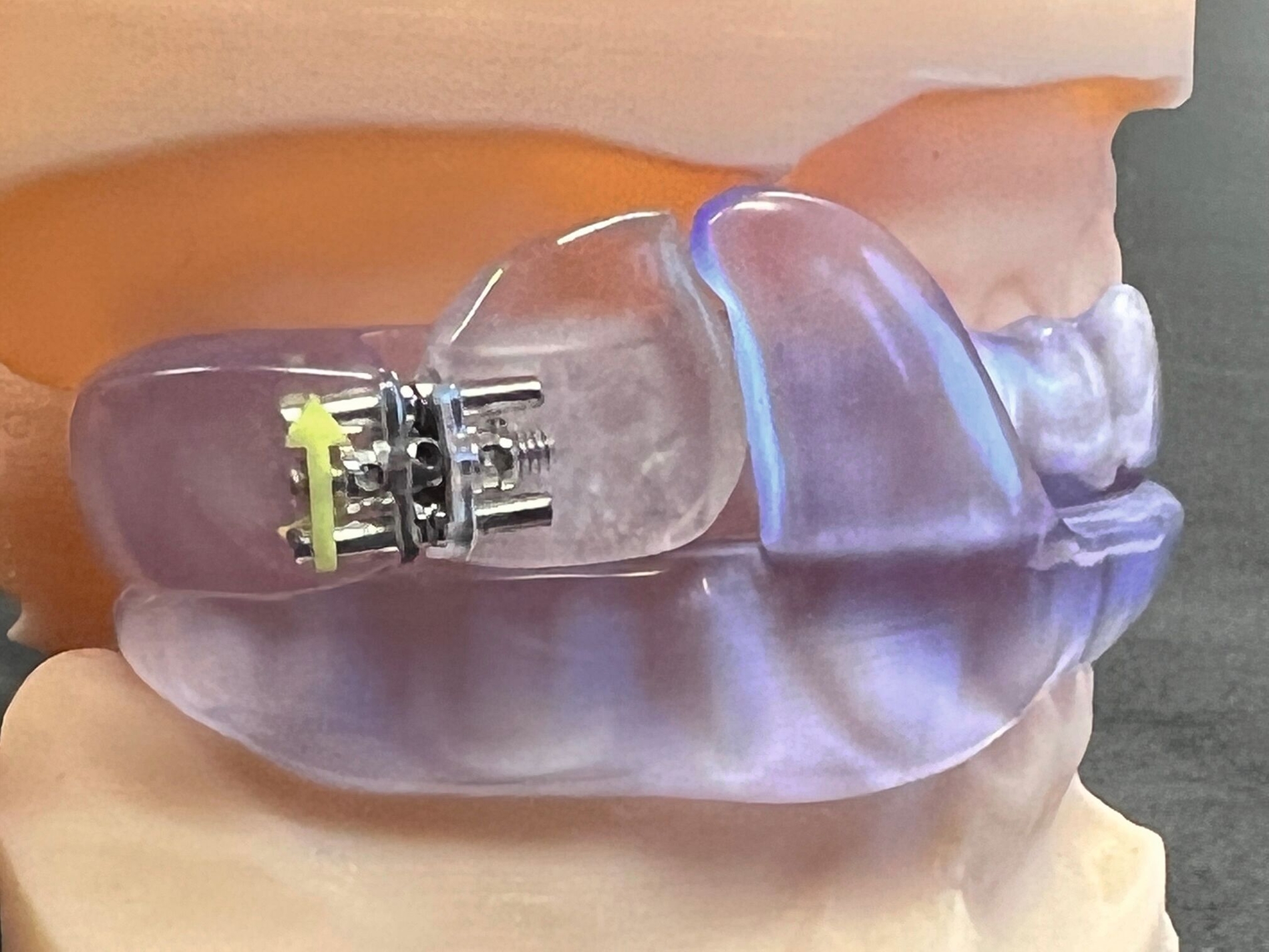 Im vorliegenden Fall fiel die Entscheidung für die patentierte, MDR-konforme (UDI 426073157F-UPS3C), thermoelastische und im CAD/CAM-Verfahren digital herzustellende F-UPS® (F) (Abbildung 4) [Schlieper, 2023]. Sie ermöglicht im Vergleich zu anderen UPS-Bauarten eine individuelle Abstimmung der Unterkieferöffnungs- und Schließbewegung auf den Funktionsbefund der Patientin. Dafür gleiten an der Unterkieferschienenbasis angebrachte flossenförmige Elemente über seitliche Führungsflächen an der Oberkieferschiene. Durch diese Funktionsadaptation kann dem Einfluss kraniofazialer Morphologien und Phänotypen auf den Bewegungsbereich des Unterkiefers [Sanz, 2021] in besonderem Maß patientenindividuell entsprochen werden.