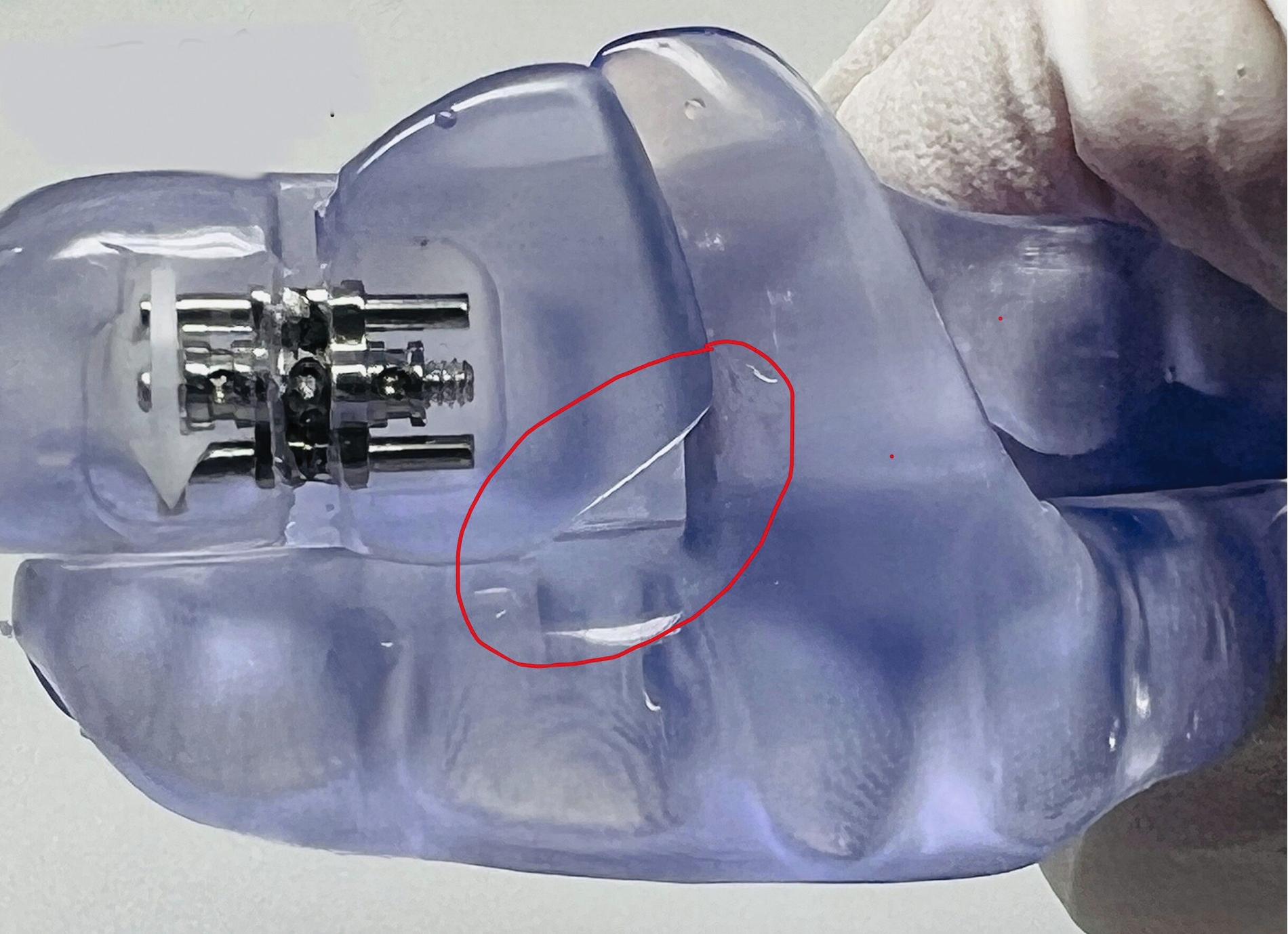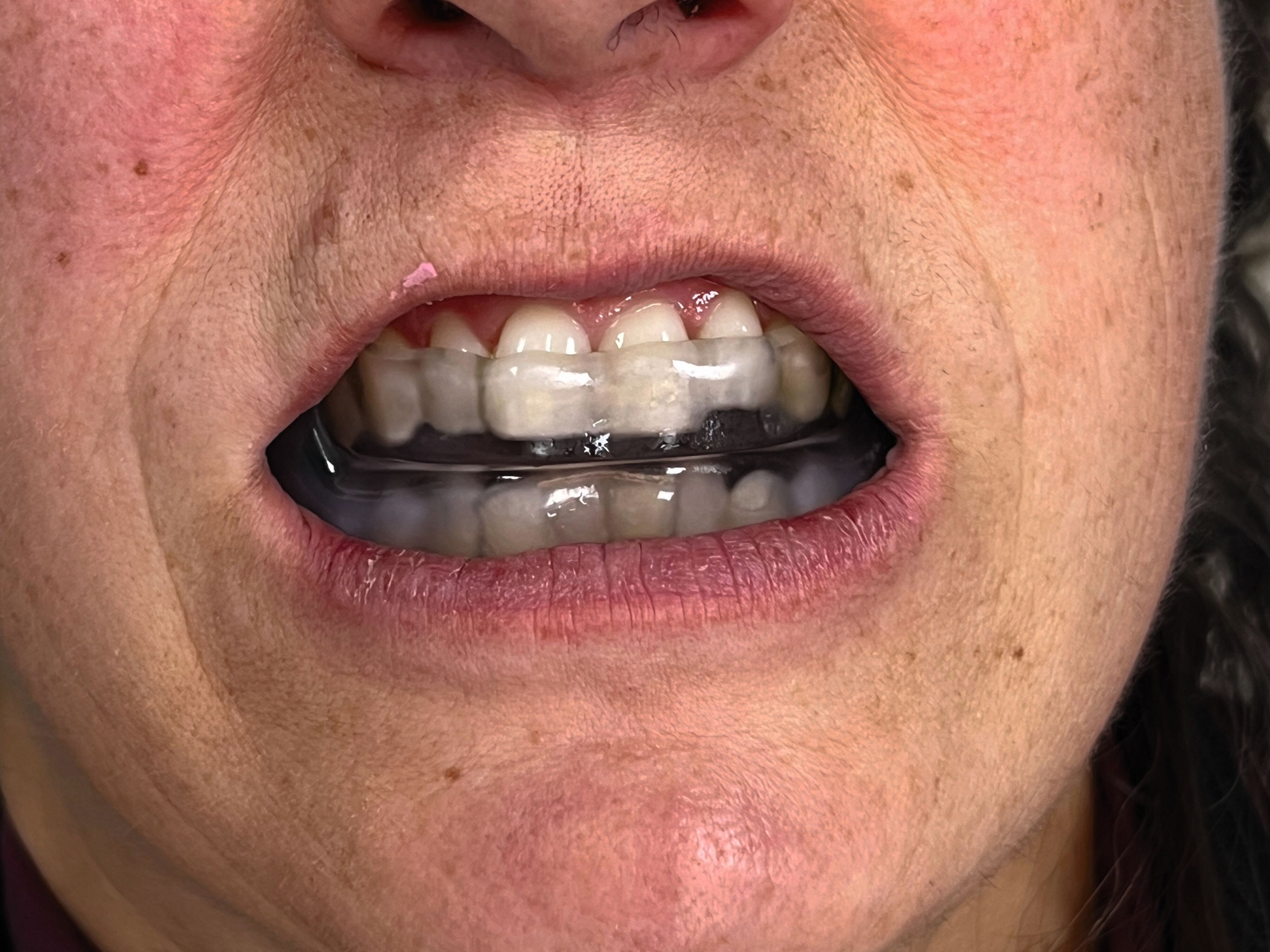 Die Eingliederung der F-UPS® fand im Dezember 2022 statt. Abbildung 10 zeigt die Flossen/Führungselemente in der SPP. Die Eingliederung beginnt obligatorisch mit dem Anwärmen der F im lauwarmen Wasserbad für zwei bis fünf Minuten, wobei die Temperatur 40 Grad Celsius nicht übersteigen darf. Hierdurch erreicht die F erst die gebrauchsfähige Elastizität für den Einsetzvorgang. Kontrolliert und bewertet wurden Passung, Retention, Tragekomfort sowie die geführten Gleitbewegungen. Wegen der vorliegenden Funktionsstörung der Kiefergelenke mussten wir die Führungsflächen für das Gleiten in die Protrusion gegenüber der Urbauart der F flacher gestalten, um die Komfortzone zu erreichen (vergleiche die Abbildungen 10 und 11B mit den Abbildungen 4B und 4C). Mit der Patientin wurden das Anwärmen, das Einsetzen und Entfernen und die obligatorische Kiefergymnastik, die nach jedem Tragen der F erfolgen soll, eingeübt, die Pflegehinweise wurden erklärt und die Bedienungsanleitung der F ausgehändigt.