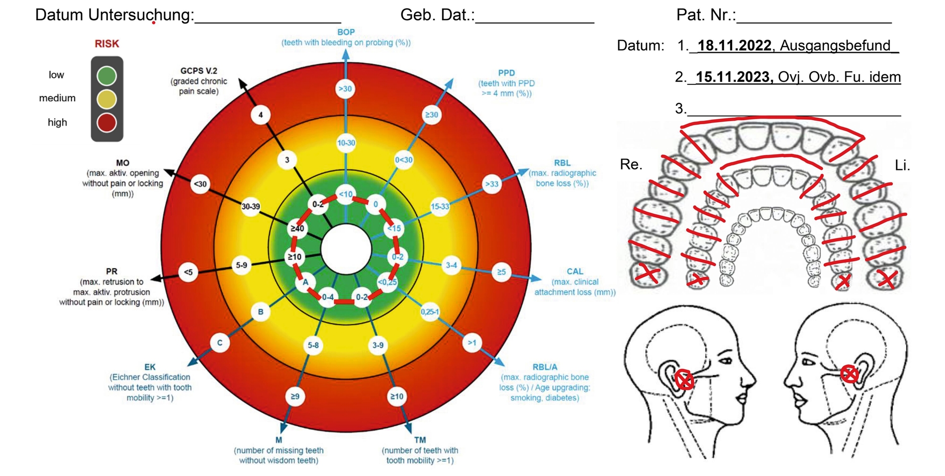 Zur Entscheidung über die Durchführung der UPS-Therapie oder über vorbereitende Maßnahmen erfolgte eine Nutzen-Risiko-Bewertung nach dem Vektordiagramm Risikoprofil (RP) (Abbildung 1) [Bernhardt et al., 2022; Schlieper, 2022]. Damit lassen sich die Prädiktoren, mit denen eine Aussage über das Risiko in den drei Bereichen Parodontologie, Prothetik und Funktion [Eichner, 1955; Schiffman et al., 2014; Tonetti und Sanz, 2019; Türp, 2000] getroffen werden kann, mit ihren Vektoren als Risikoprofil visuell leicht erfassen und im Laufe des Recalls in ihrem Verlauf miteinander vergleichen.