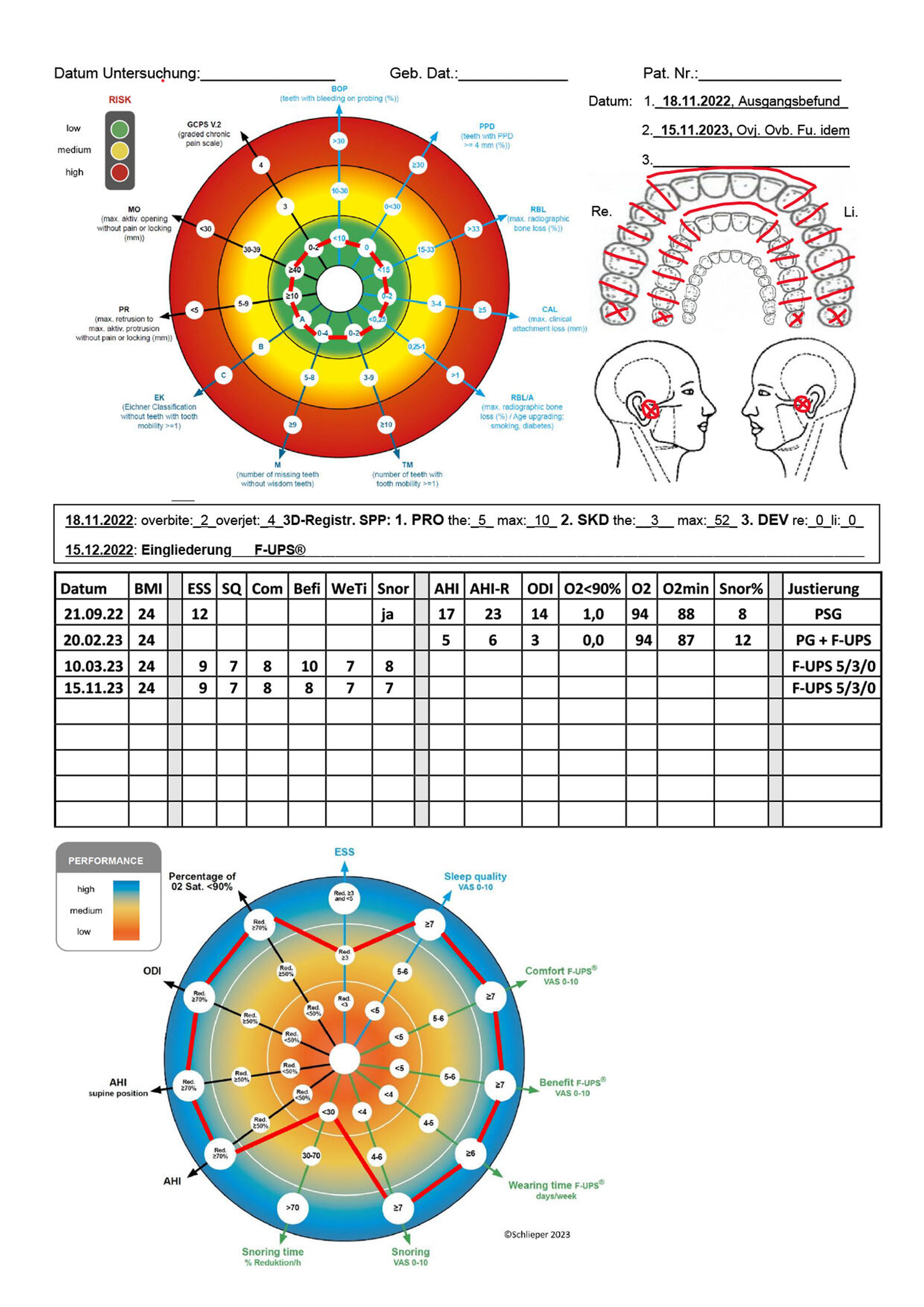 Nach Eingliederung der F folgten nach einer Eingewöhnungsphase am 20. Februar 2023 eine schlafmedizinische und zwei zahnmedizinische Kontrollen am 10. März und am 15. November 2023 mit dem Vergleich der erhobenen Verlaufsdaten (Abbildung 12). Ziel ist die Effektivitätsbewertung der Therapie mit der Risiko-Nutzen-Analyse für die Patientin. Davon hängt ab, ob die Indikation für oder gegen eine Nachjustierung oder sogar gegen die Fortführung der Therapie gestellt werden muss. Dies geschieht in einem interdisziplinären Austausch zwischen Schlafmediziner und Zahnarzt. Ob oder inwieweit die UPS geeignet ist, das Behandlungsziel zu erreichen, also die Effektivität ausreicht, ist von zwei Faktoren abhängig:
