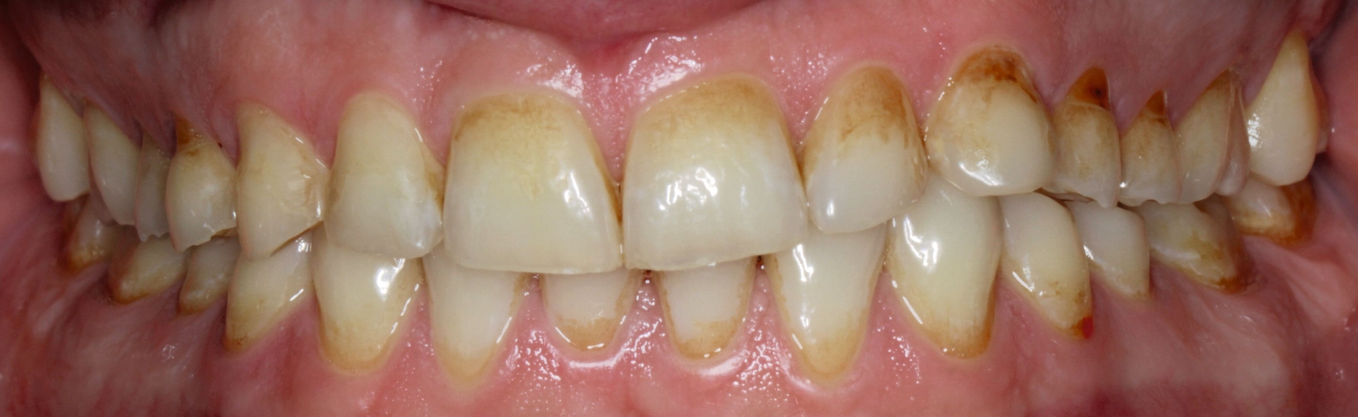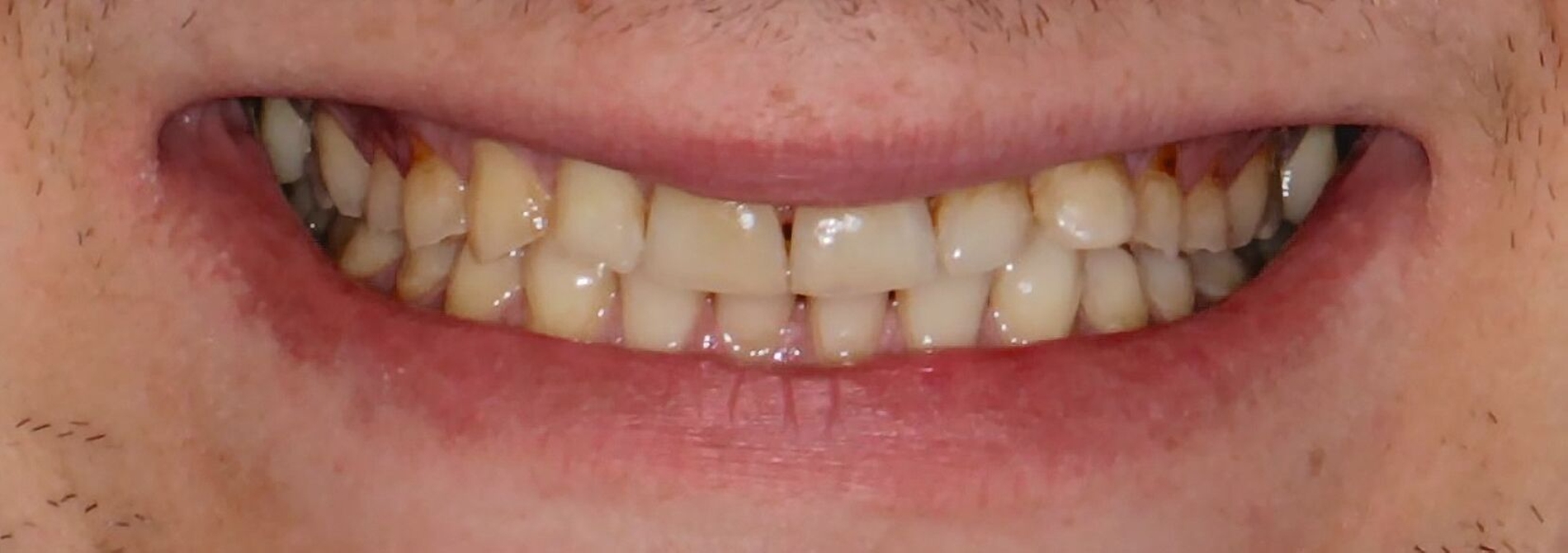 Der 26-jährige Patient stellte sich erstmalig im Oktober 2021 mit dem Wunsch nach einer Gesamtrehabilitation des Gebisses vor. Er betreibt Kraftdreikampf, international bekannt unter dem Namen Powerlifting, und nimmt regelmäßig an Wettkämpfen teil. Es handelt sich dabei um eine kraftintensive Sportart, welche der Schwerathletik zugerechnet wird. In den drei Disziplinen Kniebeugen, Bankdrücken und Kreuzheben werden abhängig vom erreichten Maximalgewicht Punkte vergeben und zusammengerechnet. Für den Athleten gehören besonders in Phasen des Muskelaufbaus kurze Essintervalle, gesüßte Workout-Booster, Proteinshakes sowie Säfte und Energydrinks zum Alltag.