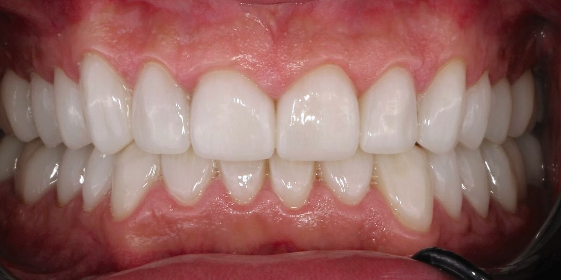 Da der Patient mit der Situation zufrieden war, konnte nach einigen Wochen die endgültige Versorgung bestehend aus Lithiumdisilikat-Kronen (e.max®, Ivoclar, Schaan, Liechtenstein) adhäsiv mit einem dualhärtenden Befestigungskomposit (RelyXUltimate™, 3M™, Neuss) eingesetzt werden. Der Patient bekam außerdem eine Unterkiefer-Aufbissschiene mit adjustierter Kaufläche für die Nacht.