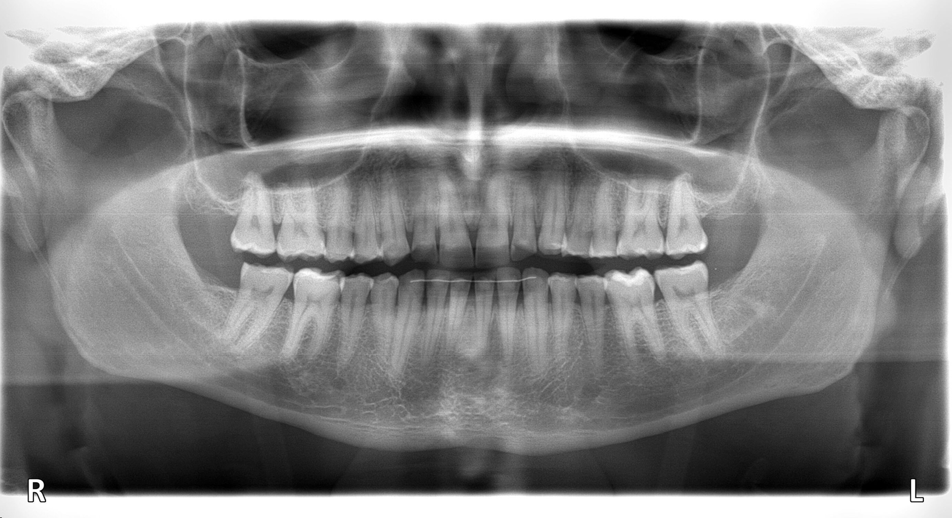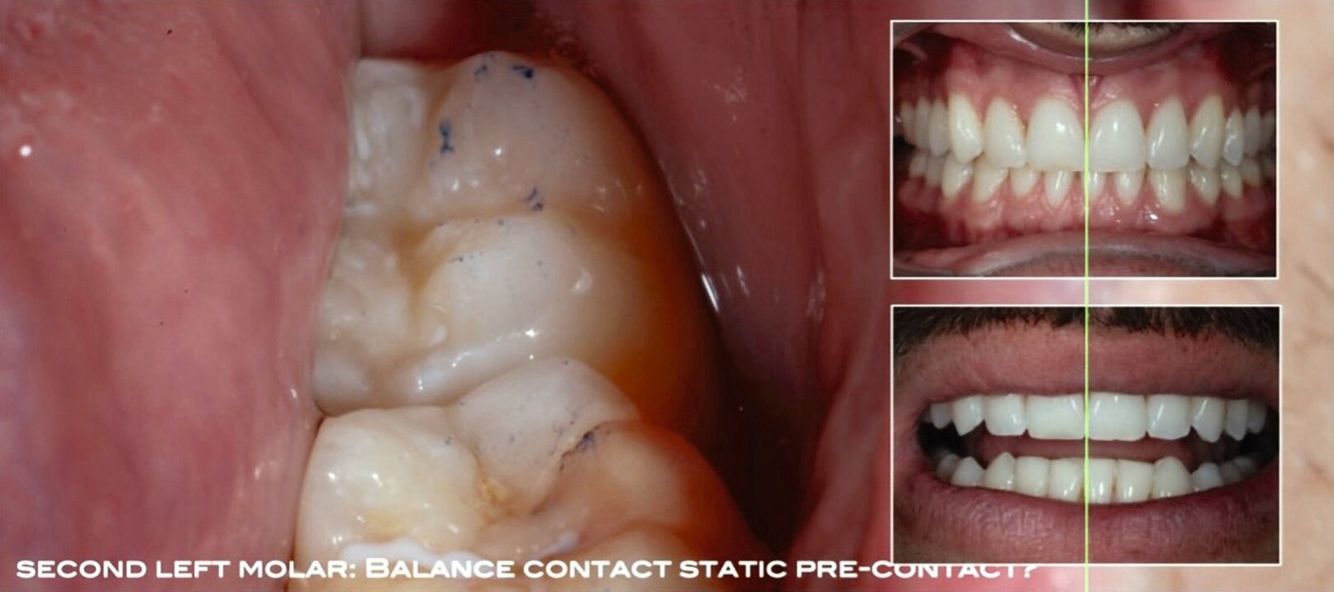 Bei der visuellen Kontrolle der Okklusion mithilfe von Okklusionspapier (40 mm) und Shimstockfolie (8 mm) konnte am Abhang des distobukkalen Höckers des Zahns 37 ein dynamischer Vorkontakt während der Laterotrusionsbewegung festgestellt werden. Im Stehen war die Kopfrotation nach links im Vergleich zu rechts eingeschränkt und es war eine leicht hochgezogene linke Schulter zu erkennen.