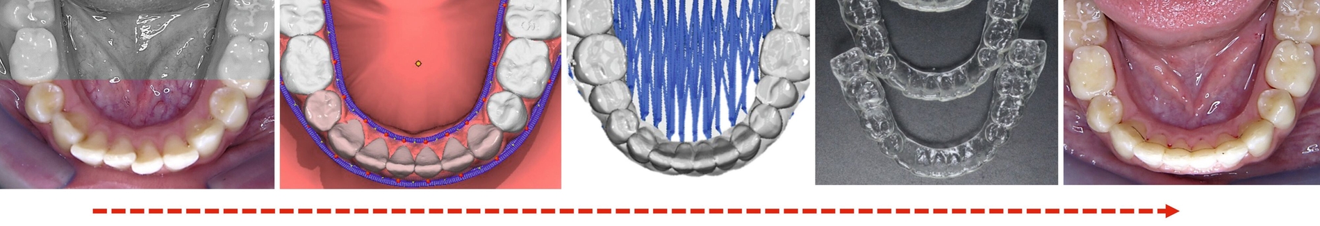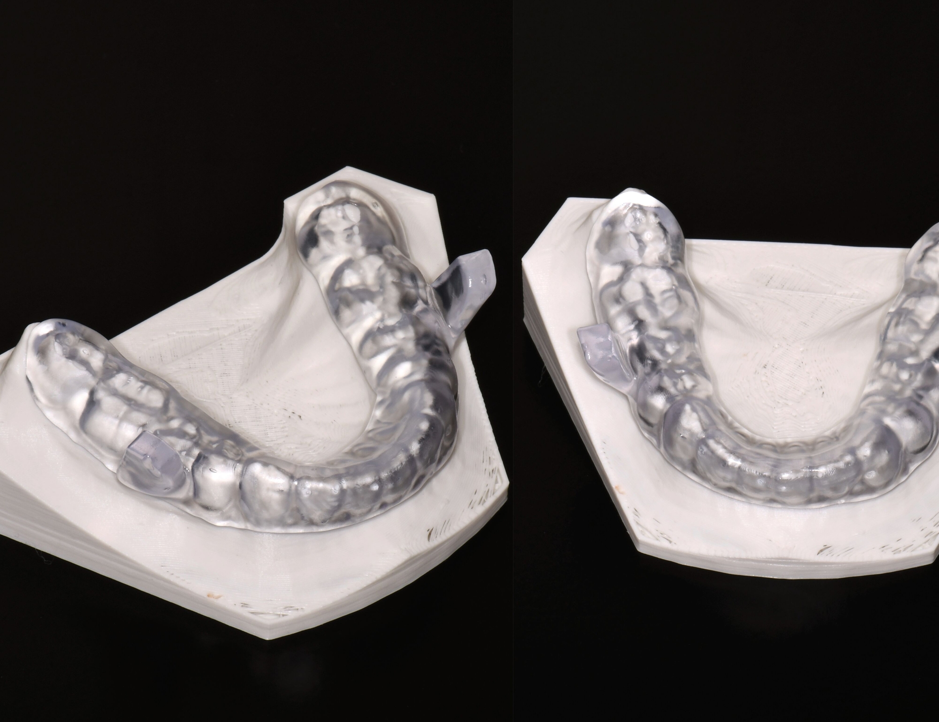 Unter den digital gefertigten kieferorthopädischen Apparaturen sind Aligner wohl das bekannteste Beispiel [Ercoli et al., 2014, Robertson et al., 2020]. Die Herstellung von Alignern selbst basiert(e) jedoch auf einer manuellen Fertigung anhand 3-D-gedruckter Modelle und stellt(e) somit bisher eher eine partiell automatisierte Fertigung dar. Die neuesten Entwicklungen erlauben mittlerweile eine Fertigung im direkten 3-D-Druckverfahren [Tartaglia et al., 2021], so dass mühsame, zeitaufwendige Zwischenschritte der manuellen Fertigung entfallen (Abbildung 1a). Weiter profitieren die Patienten von individuelleren Fertigungsmöglichkeiten, da durch die Umsetzung im 3-D-Druck zusätzliche Elemente einfacher und stabiler in den Aligner inkorporiert werden können (Abbildung 1b).