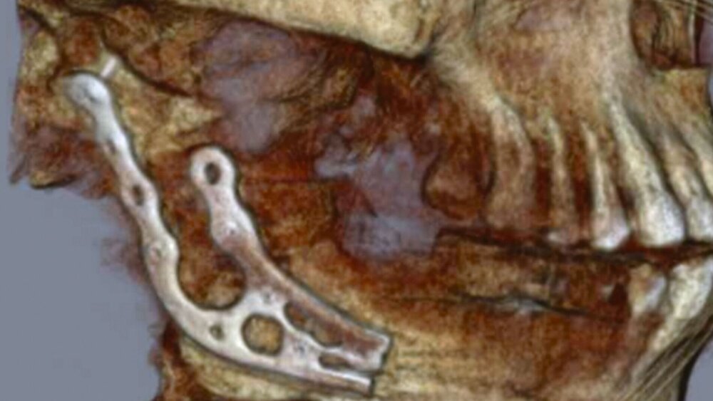 Danach wurde ein avaskuläres Beckenkammtransplantat vom rechten Becken entnommen. Die Auswahl eines avaskulären Knochentransplantats wurde aufgrund der klinischen Umstände und der präoperativen Planung bevorzugt, um eine möglichst schonende und risikoarme Vorgehensweise zu gewährleisten. Das Transplantat wurde anschließend in regelhafter Okklusion mittels präformierter Rekonstruktionsplatte eingebracht und osteosynthetisch fixiert. (Abbildungen 2 und 3).