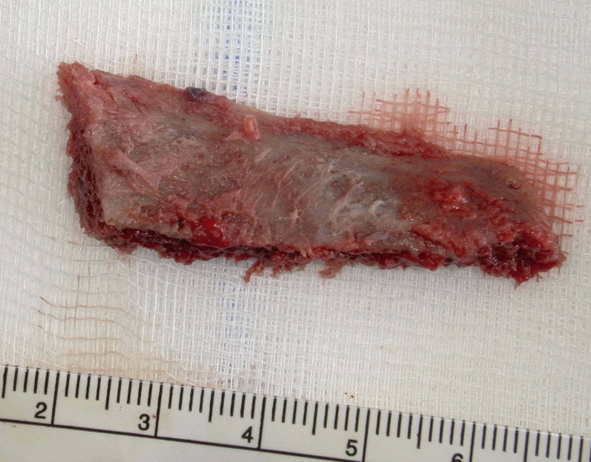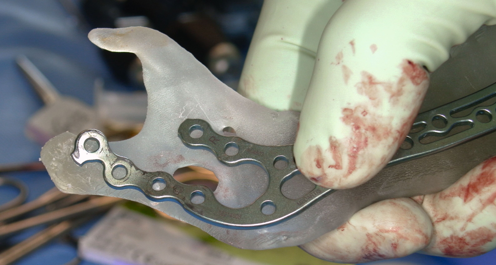 Aufgrund der Rezidivsituation entschied man sich im gemeinsamen Konsens für eine Kontinuitätsresektion. Die ursprünglich anvisierte mikrovaskuläre Rekonstruktion wurde aufgrund der erwarteten verlängerten Operationszeit, des hohen kardialen Risikos und des in angiologischen Voruntersuchungen als insuffizient eingeschätzten Gefäßstatus sowie der gegensätzlichen Entscheidung des Patienten zugunsten eines avaskulären autologen Beckenkammtransplantats geändert. Präoperativ wurde die Resektion entsprechend an einem gedruckten 3-D-Modell geplant und durchgeführt. Eine Rekonstruktionsplatte wurde präformiert und die Ausmaße des autologen Beckenkammtransplantats wurden festgelegt.