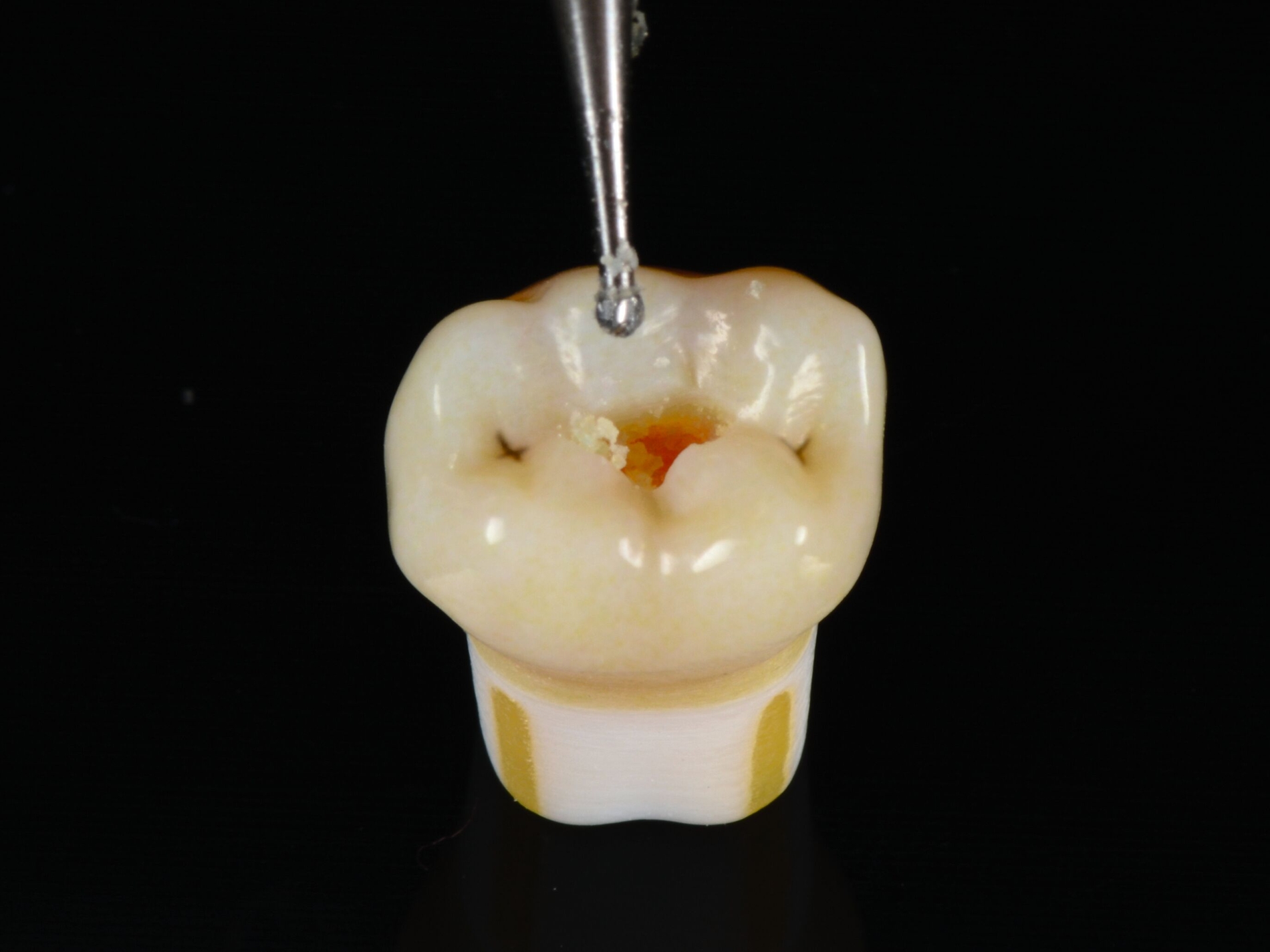 Aufgrund der speziell angepassten Härte der verschiedenen Druckmaterialien können moderne Konzepte wie die selektive Kariesexkavation durch Polymerbohrer umgesetzt werden. Angrenzend an die zu entfernende Karies kann eine Schicht verfärbtes Dentin gedruckt werden, das durch seine höhere Härte etwaige Polymerbohrer abnutzt und den fließenden Übergang zwischen verschiedenen Dentinzonen simuliert.