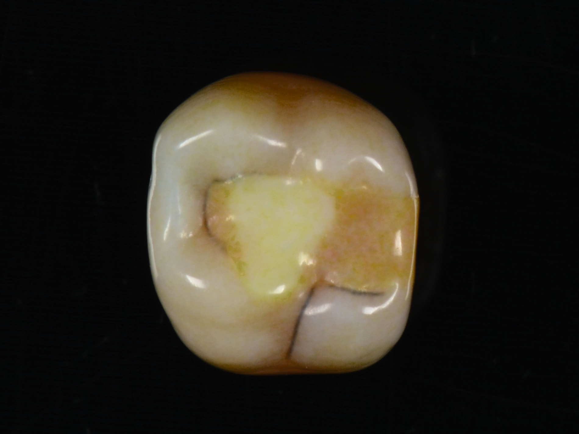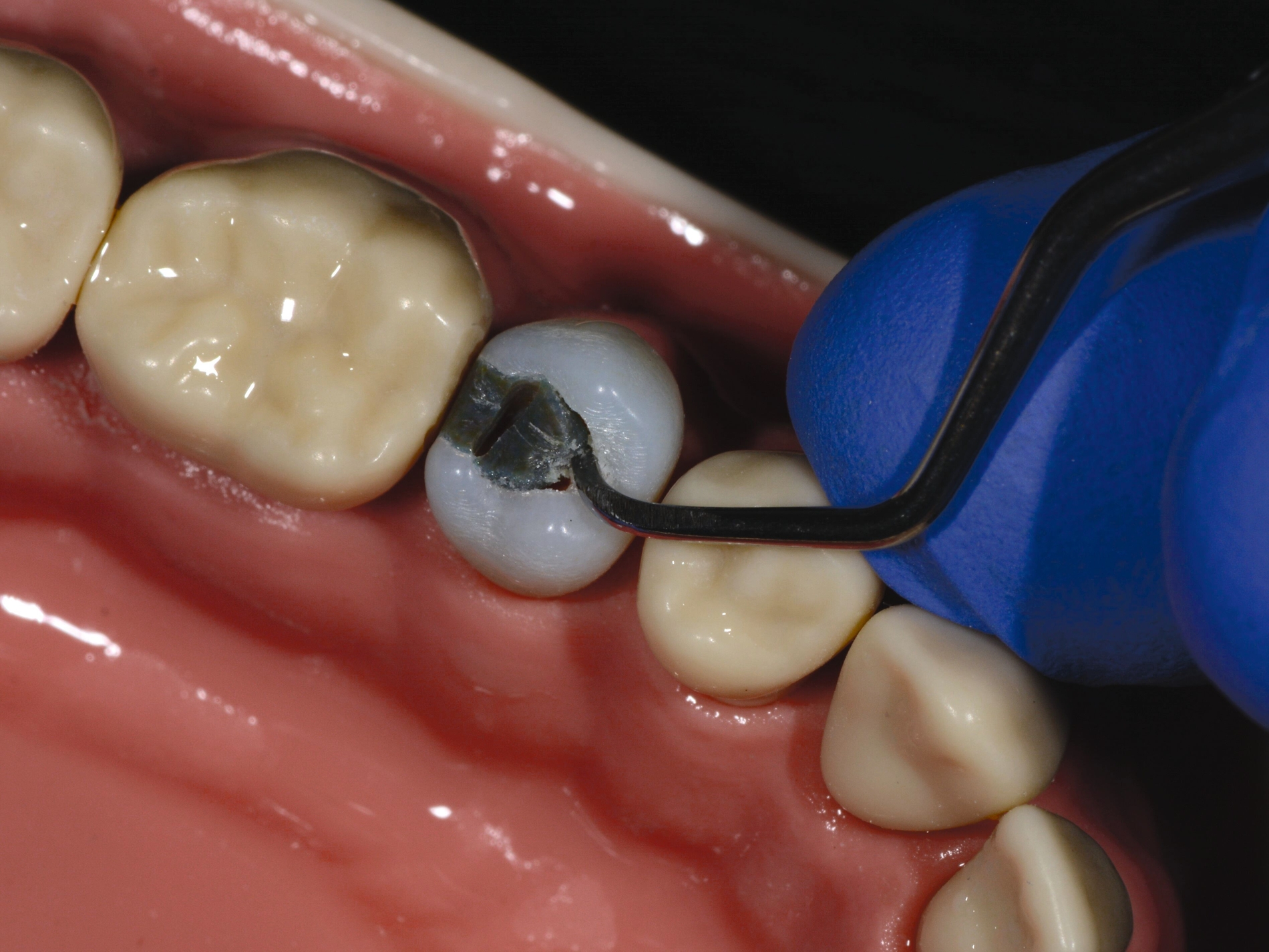 Neben Form, Größe und Lokalisation der Karies innerhalb des Zahnes kann auch eine pseudointakte Schmelzschicht oder die Beziehung zu einer Restauration im Sinne einer Sekundärkaries umgesetzt werden (Abbildung 3). Das kariös befallene Dentin besteht hierbei aus einem weichen, leicht feuchten, bräunlichen Material, das sich mit dem Rosenbohrer spanend entfernen lässt (Abbildungen 4 und 5).