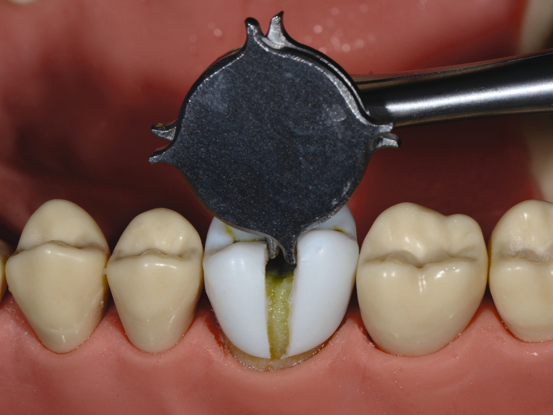 Mit der speziellen Drucktechnologie ist es auch möglich, Restaurationsmaterial in seiner Optik und teilweise in seinen klinischen Eigenschaften zu simulieren. Eine simulierte Amalgamfüllung kann geschlitzt und anschließend partiell entfernt werden (Abbildung 7), während eine simulierte Kompositfüllung fest an der umliegenden simulierten Zahnhartsubstanz haftet und herausgeschliffen werden muss.