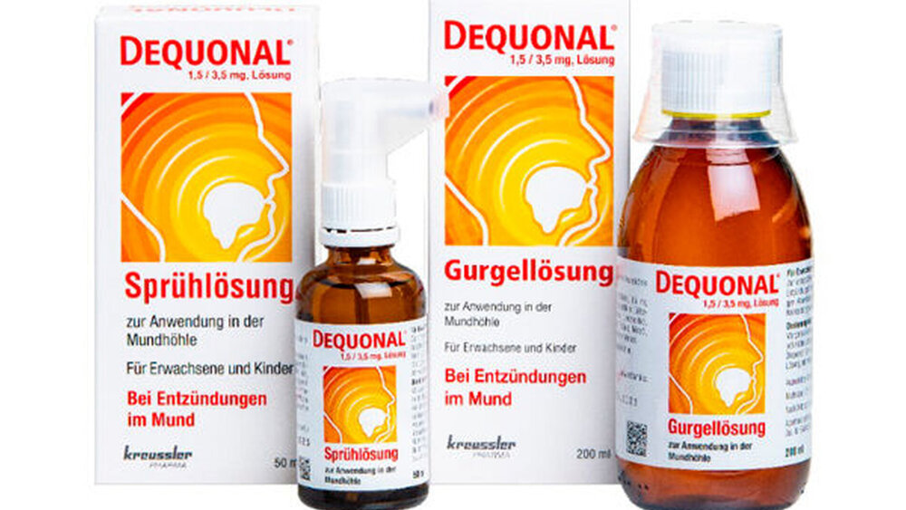 Eine schnelle und flexible Anwendung im Alltag für unterwegs bietet DEQUONAL in der 50 ml-Flasche mit praktischem Sprühaufsatz (PZN 02057352). Für Zuhause oder die Praxis ist DEQUONAL als Gurgellösung in der 200 ml Flasche (PZN 01872512) erhältlich.