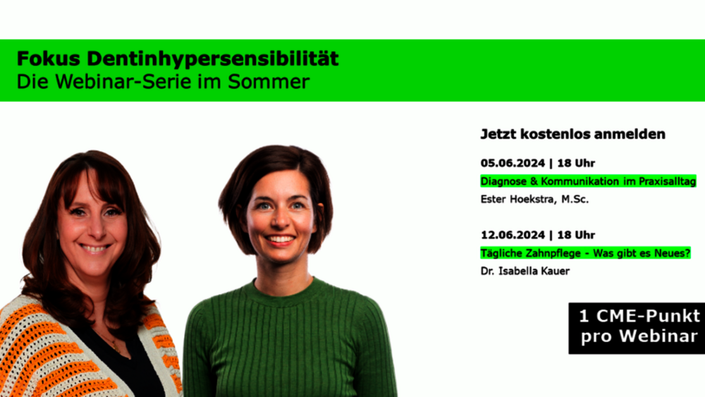 Im Juni erwarten Sie zwei Live-Webinare zum Thema Dentinhypersensibilität. Erhalten Sie je einen CME-Punkt pro Webinar und profitieren Sie von geballtem Expertenwissen. Melden Sie sich jetzt kostenfrei an: