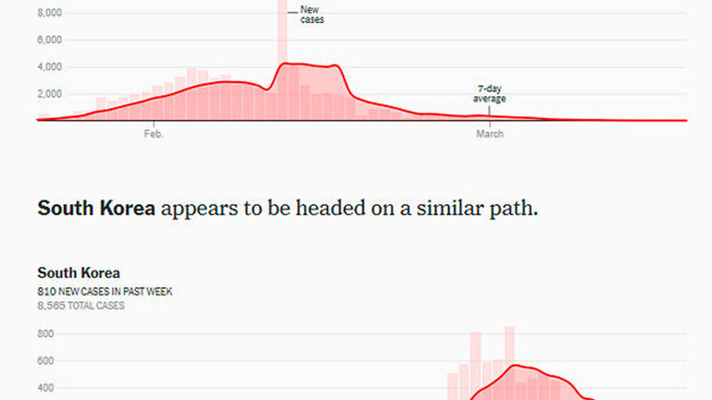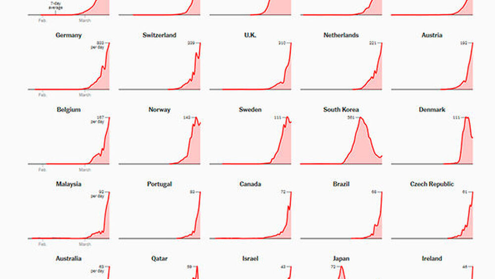 Eine weitere Veröffentlichung der Zeitung zeigt, wie die Entwicklung in China in einem Kurvendiagramm aussieht und zeigt die Zahl der Neuinfektionen mit Covid-19 in 63 weiteren Ländern weltweit. Fast überall signalisieren die Kurven stark ansteigende Zahlen von Neuinfektionen, zuweilen auch – wie etwa in Japan – nach zwischenzeitlichen Rückgängen. Aber es gibt auch positive Trends: In Dänemark, Slowenien und Katar sinkt die Zahl der Neuinfektionen, wenn auch auf niedrigem absoluten Niveau, deutlich.