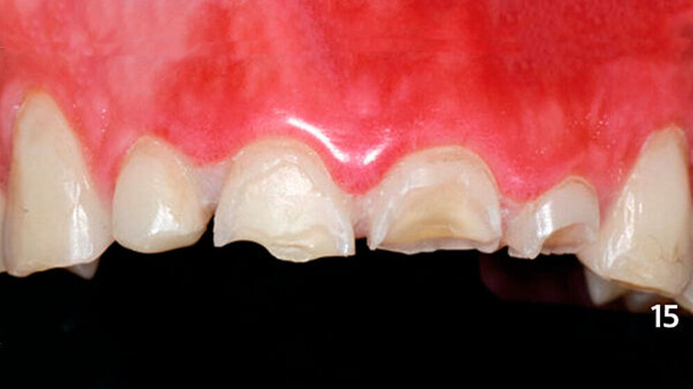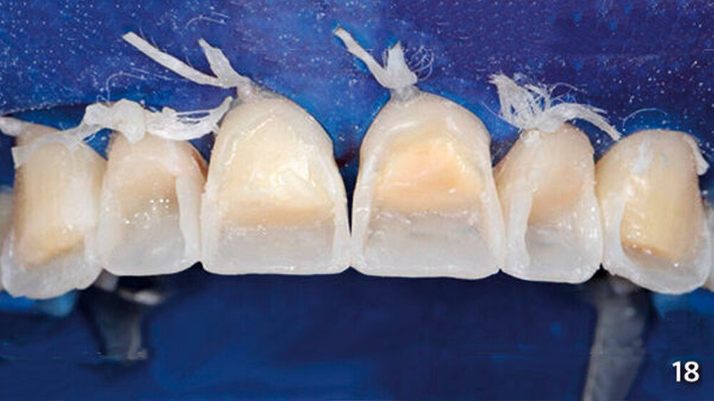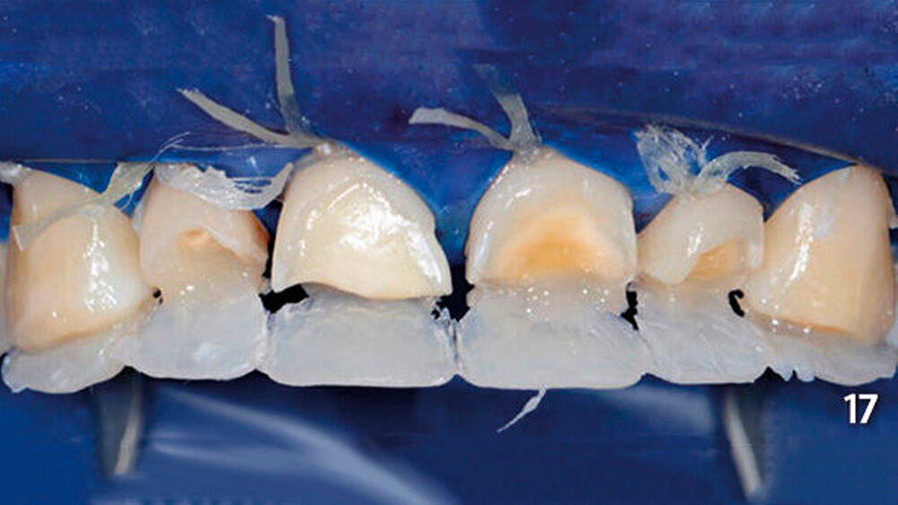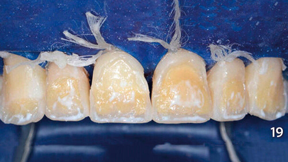 Nach Kofferdamapplikation und Vorbehandlung mit Adhäsiv konnte nun mithilfe des Silikonschlüssels der inzisal-palatinale Anteil der Zähne mit Komposit-Schmelzmasse (Farbe A2E) aufgebaut werden (Abb. 17). Schließlich wurden mithilfe von Transparentmatrizen die approximalen Randleisten ebenfalls mit Schmelzmasse modelliert (Abb. 18). In die so gestaltete Umrissform der Zähne wurden nach Entfernung der Matrizen Kompositdentinmassen (Farbe A4D) appliziert und mit Effektfarbe (Farbe Y) sowie weißer Malfarbe (IPS Empress Direct Color, IvoclarVivadent, Schaan, Liechtenstein) charakterisiert (Abb. 19).