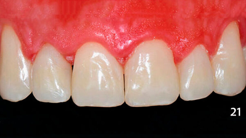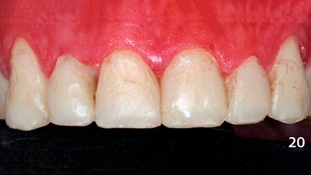 Die Dentinmassen wurden dann von bukkal im inzisalen Anteil mit einer dünnen Schicht Schmelzmasse überschichtet, die im zervikalen Bereich der Zähne mit Bodymasse (Farbe A3B) ergänzt wurde und an diesem Tage aufgrund Zeitmangels nur grob ausgearbeitet wurden. Die Restaurationen stellten sich in der darauffolgenden Sitzung mit oberflächlichen Verfärbungen dar (Abb. 20) und wurden nun vollständig ausgearbeitet und poliert (Abb. 21).