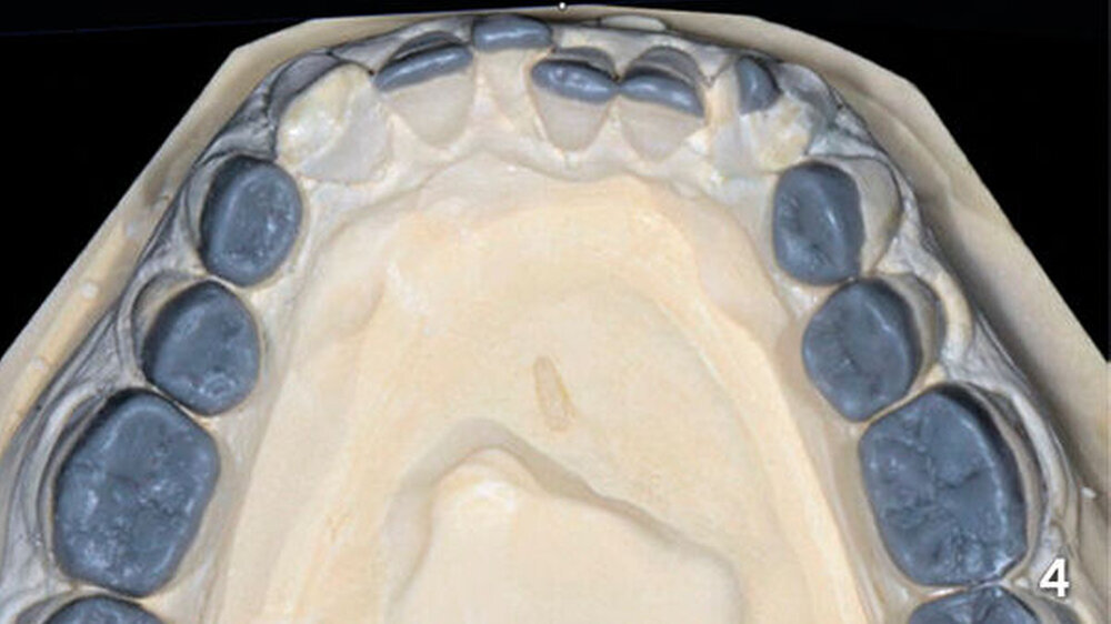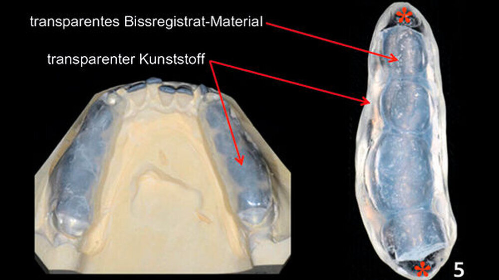 Bei der Anfertigung der Wax-up-Modelle wurden jeweils die Eckzähne und Bereiche der endständigen Molaren nicht mit Wachs aufgebaut (Abb. 4). Auf den Modellen wurden dann für den Unterkiefer je zwei stabile, lichtdurchlässige Übertragungsschienen hergestellt, die später im Mund eine ausreichende Abstützung an den nicht aufgewachsten Eckzähnen und den distalen Bereichen der endständigen Molaren gewährleisteten (Abb. 5).