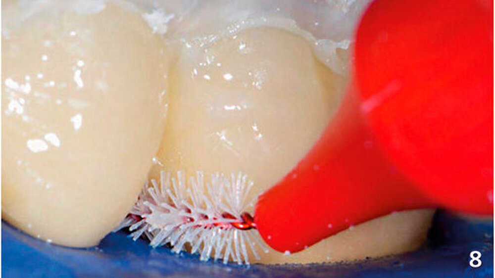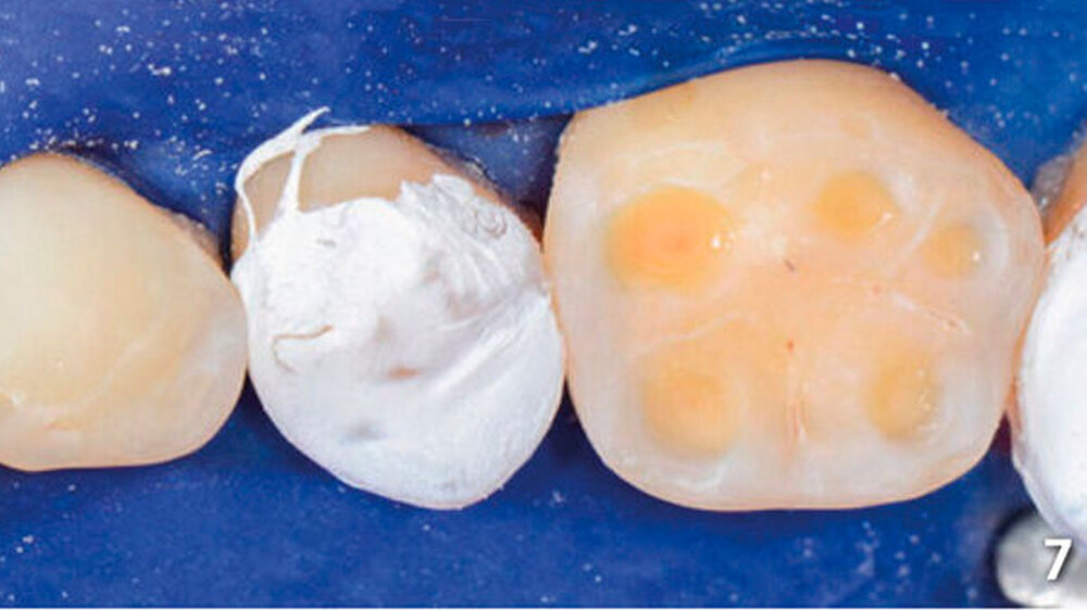 In er Zwischenzeit wurden die Nachbarzähne der zu restaurierenden Zähne mit Teflonband isoliert (Abb. 7). Die vorhandenen Kompositoberflächen der Zähne wurden entsprechend dem Vorgehen bei einer Korrekturfüllung mit einem Sandstrahler (Microetcher, Danville Engineering, Danville, USA) mit 50 μm Al2 O3-Pulver (MS Dental, Busswil, Schweiz) angeraut und silanisiert (Monobond Plus, IvoclarVivadent, Schaan, Liechtenstein).