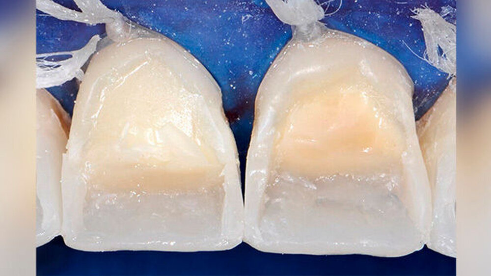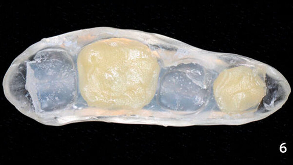 Das Komposit wurde dazu in einer der fehlenden Zahnsubstanz entsprechenden Menge in die Übertragungsschiene (Abb. 6) eingebracht und unter einem selbsthergestellten Lichtschutz aus Teflon für etwa 5 Minuten auf einer Wärmeplatte (Calset; AdDent, Danbury, USA) erwärmt. Durch das Erwärmen wird die Fließeigenschaft des Komposits verbessert, wodurch die Positionierung der Schiene erleichtert wird, ohne die Materialeigenschaften des Komposits zu beeinträchtigen (Tauböck et al. 2015).