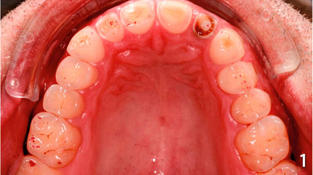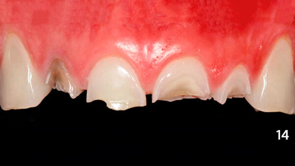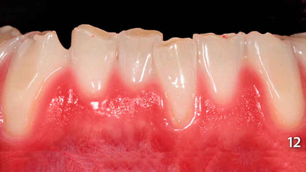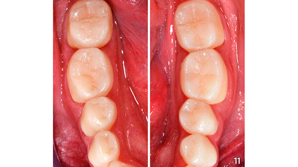 Abschließend erhielt der Patient eine weiche Tiefziehschiene zum Schutz der Restaurationen und wurde instruiert, diese insbesondere nachts zu tragen. Drei Wochen nach Abschluss der Therapie stellte sich der Patient mit einer Kompositabsplitterung am Zahn 12 dar, die mit einer Korrekturrestauration wiederhergestellt werden konnte.