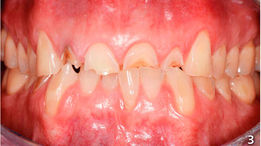 Der Patient wies an allen Frontzähnen sowie an den Seitenzähnen des Unterkiefers starke erosive Defekte auf (Abb. 1-3). Der Patient störte sich vor allem am Erscheinungsbild seiner Oberkieferfrontzähne und dem Engstand im Unterkiefer-Frontzahnbereich. Er wurde über verschiedene Therapiemöglichkeiten ausführlich aufgeklärt und entschied sich für direkte Rekonstruktionen mit Komposit. Im Februar 2016 erfolgte die Versorgung mit Kompositrestaurationen, wie folgt beschrieben.