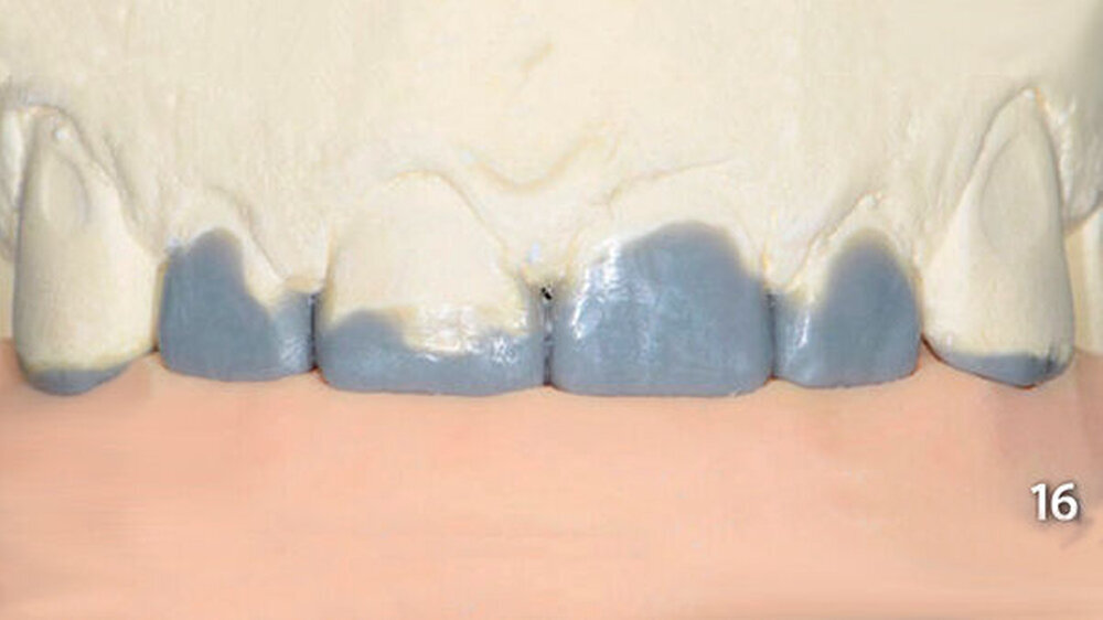 Nach der Bisshebung im Unterkiefer wurden die erosiven Frontzahndefekte im Oberkiefer ebenfalls mit Kompositadhäsiv versorgt (Abb. 14). Zunächst wurden die bukkalen Zahnhartsubstanzverluste freihändig mit Komposit aufgebaut (Abb. 15), und es wurde eine Alginatabformung genommen. Im zahntechnischen Labor wurden die inzisalen Anteile der Zähne aufgewachst, sodass anschließend ein Silikonschlüssel angefertigt werden konnte (Abb. 16).