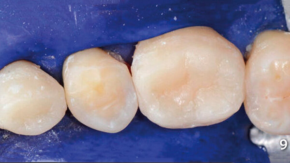 In einer ersten Phase wurden die bukkal vorhandenen Erosionsschäden versorgt. Hierzu sowie für alle weiteren Restaurationen wurde das nanogefüllte Kompositmaterial Filte Supreme XTE (3M Espe, St. Paul, USA) in Kombination mit dem 3-Schritt-Etch-and-rinse-Adhäsivsystem Optibond FL (Kerr, Orange, USA) verwendet. Die vorgängige Versorgung der bukkalen Erosionsschäden erfolgte, um die spätere Applikation von Kofferdam zu ermöglichen und die Herstellung der direkten okklusalen Kompositaufbauten zu erleichtern.