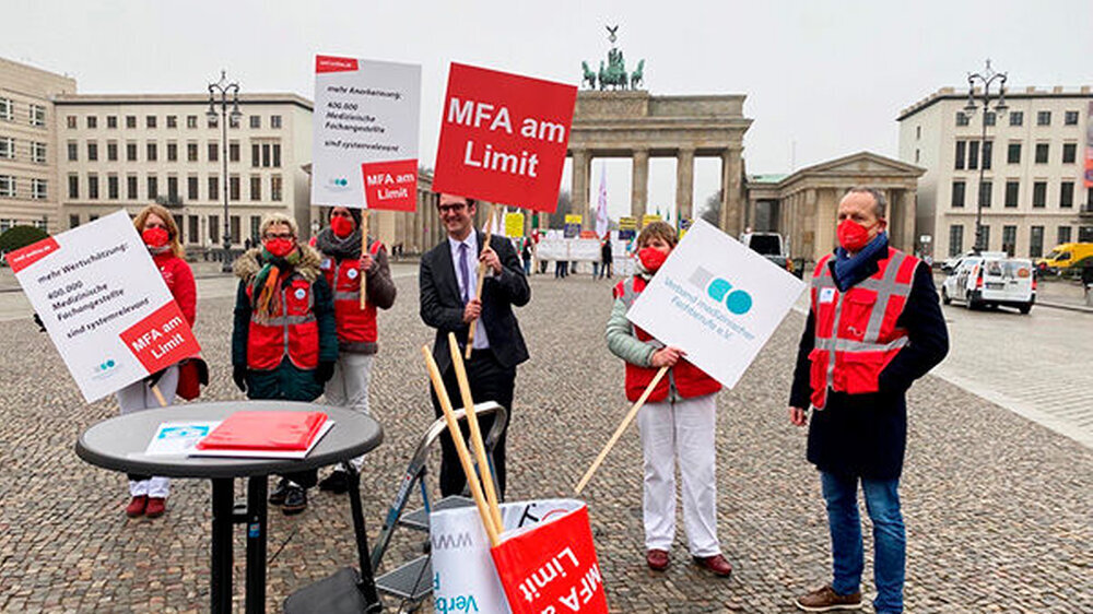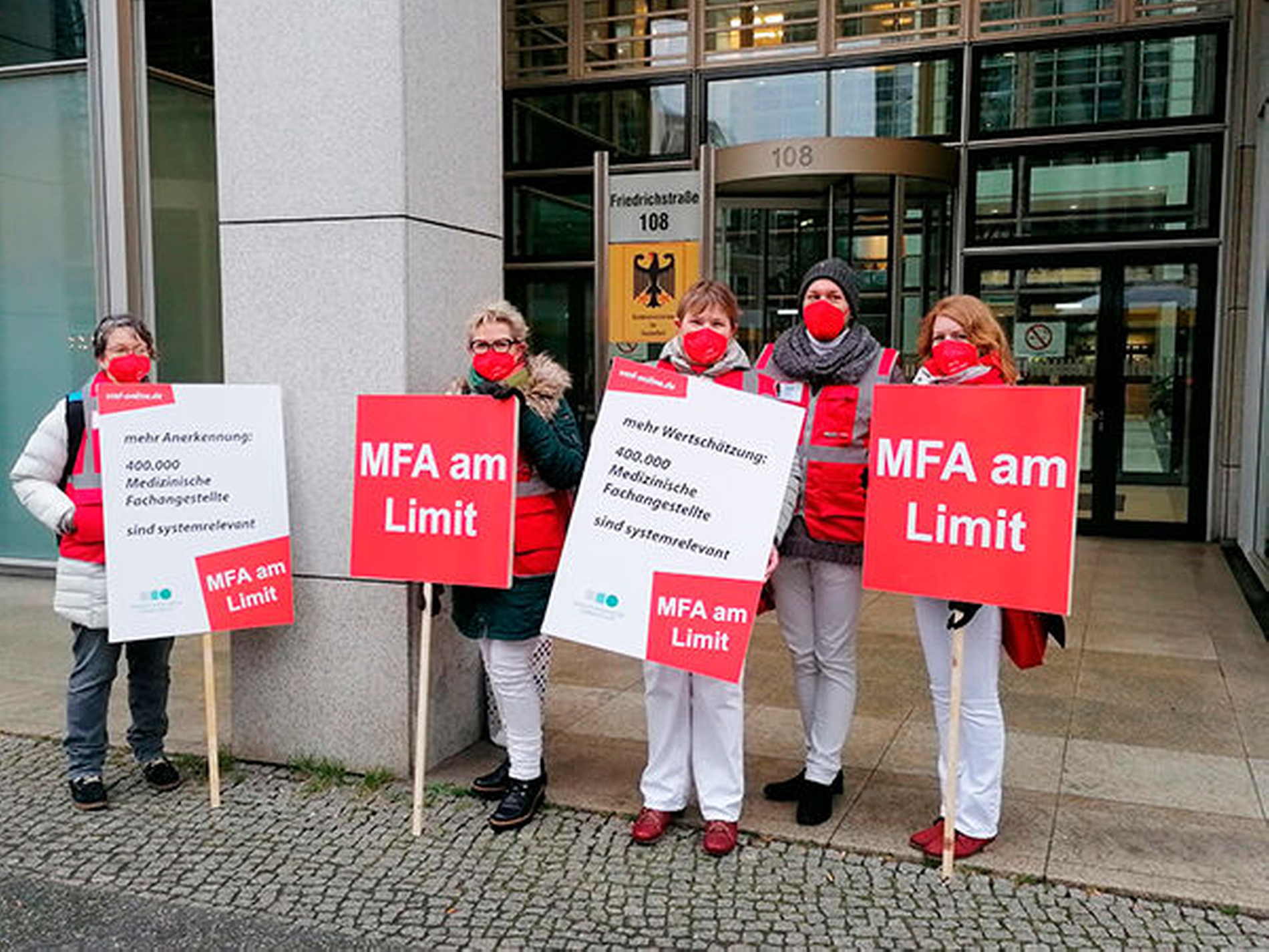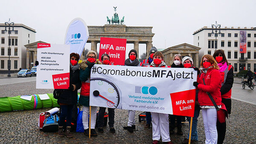 Nachdem die Staatssekretärin des Bundesgesundheitsministeriums (BMG), Sabine Dittmar, klargestellt hat, dass es keinen staatlichen Corona-Bonus für Medizinische Fachangestellte (MFA) und Zahnmedizinische Fachangestellte (ZFA) geben wird, machte sich der Verband medizinischer Fachberufe (VmF) bereits vergangene Woche in der Presse Luft und organisierte eine erneute Protestaktion vor dem Brandenburger Tor in Berlin-Mitte. Unterstützt wurden die demonstrierenden Angestellten aus den medizinischen Berufen auch von Vertretern der Bundeszahnärztekammer (BZÄK) vor Ort.