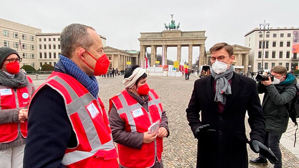 Konstantin von Laffert, Vizepräsident der BZÄK, sagte heute auf der Demo: "Viele Zahnärztinnen und Zahnärzte haben schon einen freiwilligen Bonus gezahlt. Aber darüber hinaus ist die gesellschaftliche Anerkennung aller Mitarbeiterinnen in den Praxen ebenso wichtig. Sie sind seit fast zwei Jahren extremen Belastungen ausgesetzt. Daher ist es eine Frage der Gerechtigkeit, ihnen den staatlichen Bonus ebenfalls zukommen zu lassen."